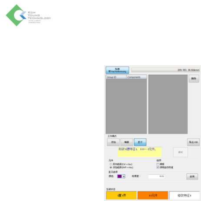 K oh Y oung Technolo g y Inc. 30 - 最小对比 : 使用 Halcon Fiducial 时的 Fiducial Threshold 值 - 方式 : 区分为 Normal 和 Advance Normal: 基本基准点 功能 Advance: 特定 基准点功能 ROI 位置 ( 像素 ): 设置 ROI 位置及尺寸 基准点大小 (mm): 设置 基准点尺寸 照明 : 选择照明 形状 : …
