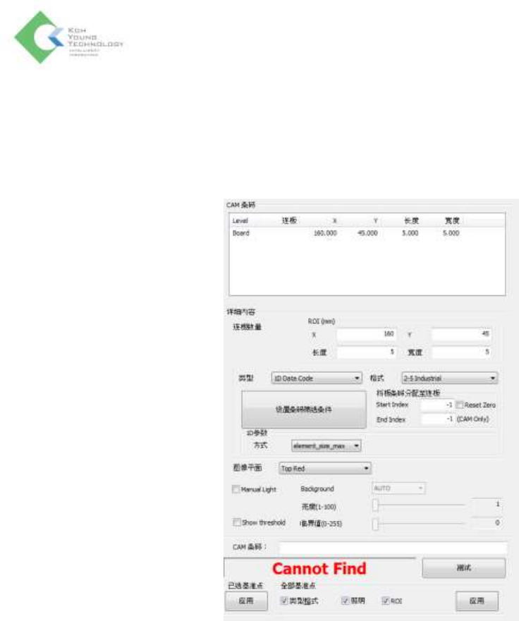 K oh Y oung Technolo g y Inc. 34 全部测试 : 测试所有坏板标记 应用已选对 : 仅应用于所选择的项目 应用到全部 : 将设置的参数应用于所有坏板标记 中间界面 ( ② ) – CAM 条码校准模式 CAM 条码目录 : 已登录的 CAM 条码 目录 连板数量 : 显示当前的连板数 ROI(mm): 设置 ROI 的坐标及尺寸 类型 : 设置 CAM 条码类型 (1D Data…