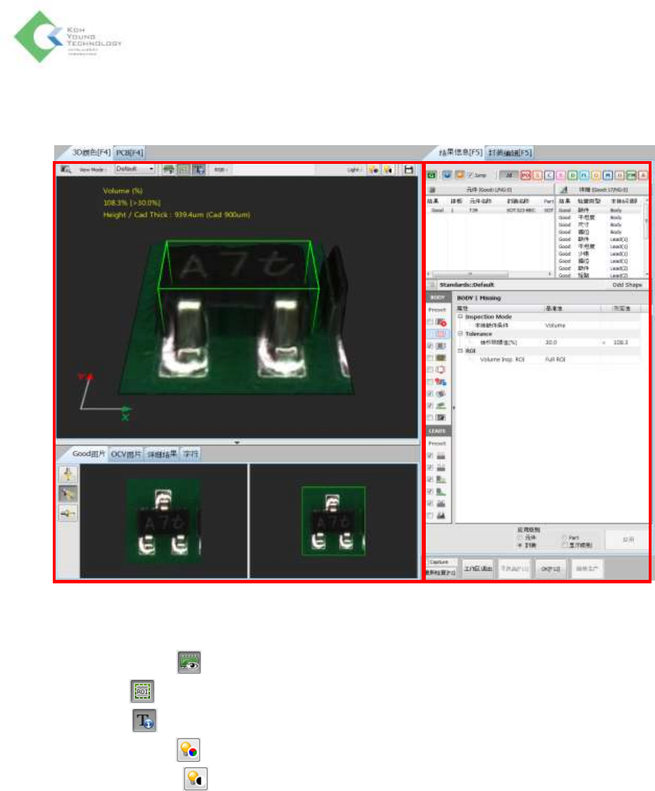 K oh Y oung Technolo g y Inc. 37 左侧界面 ( ① ) – PCB[F4] 选择模式 : 从下列项目中选择要使用的功能 - 元件 : 可以 编辑 和检查的状态 - 未使用 : 对选择的元件不进行检查 - 重新使用 : 把设置成“未使用”的元件变更为可以检测的状态 T / M / B Light: 显示所选的元件的 top 、 middle 、 bottom 照明图片 Navigation Ma…