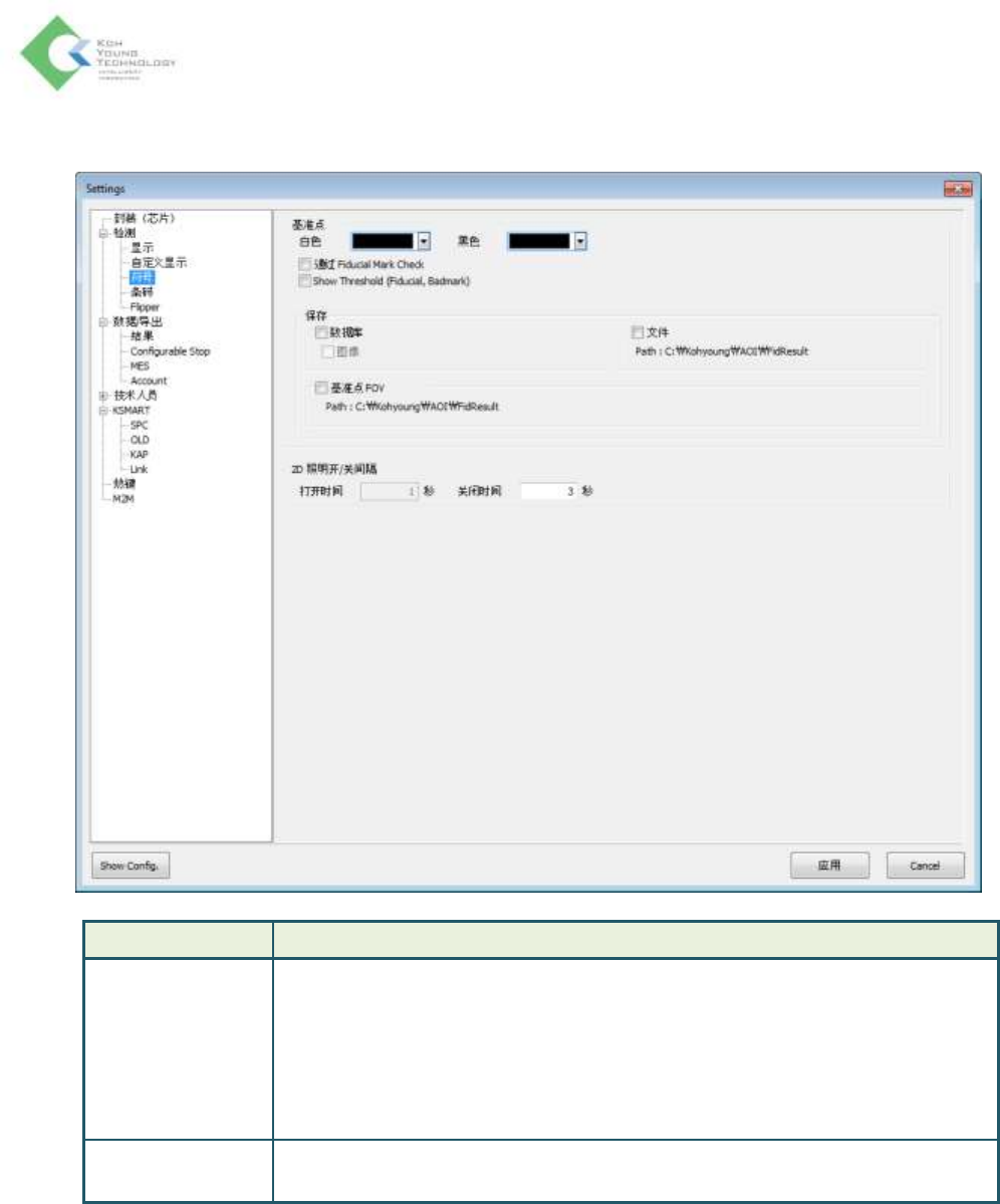 K oh Y oung Technolo g y Inc. 47 检测 > 条码 项目 说明 条码 跳过串联条形码检查 : 检测 无外接条码的 PCB 时勾选 没有条码时停止测试 : 没有检出 CAM 条码时停止检测 检查条码最小长度(仅针对内联条码 ) : 设置条码长度 板进入前弹出条码输入窗口 : 设置是否弹出条码输入窗 条码筛选器 ( 内 联 CAM) 全局 : 在 AOIGUISetup 文件保存对条码…