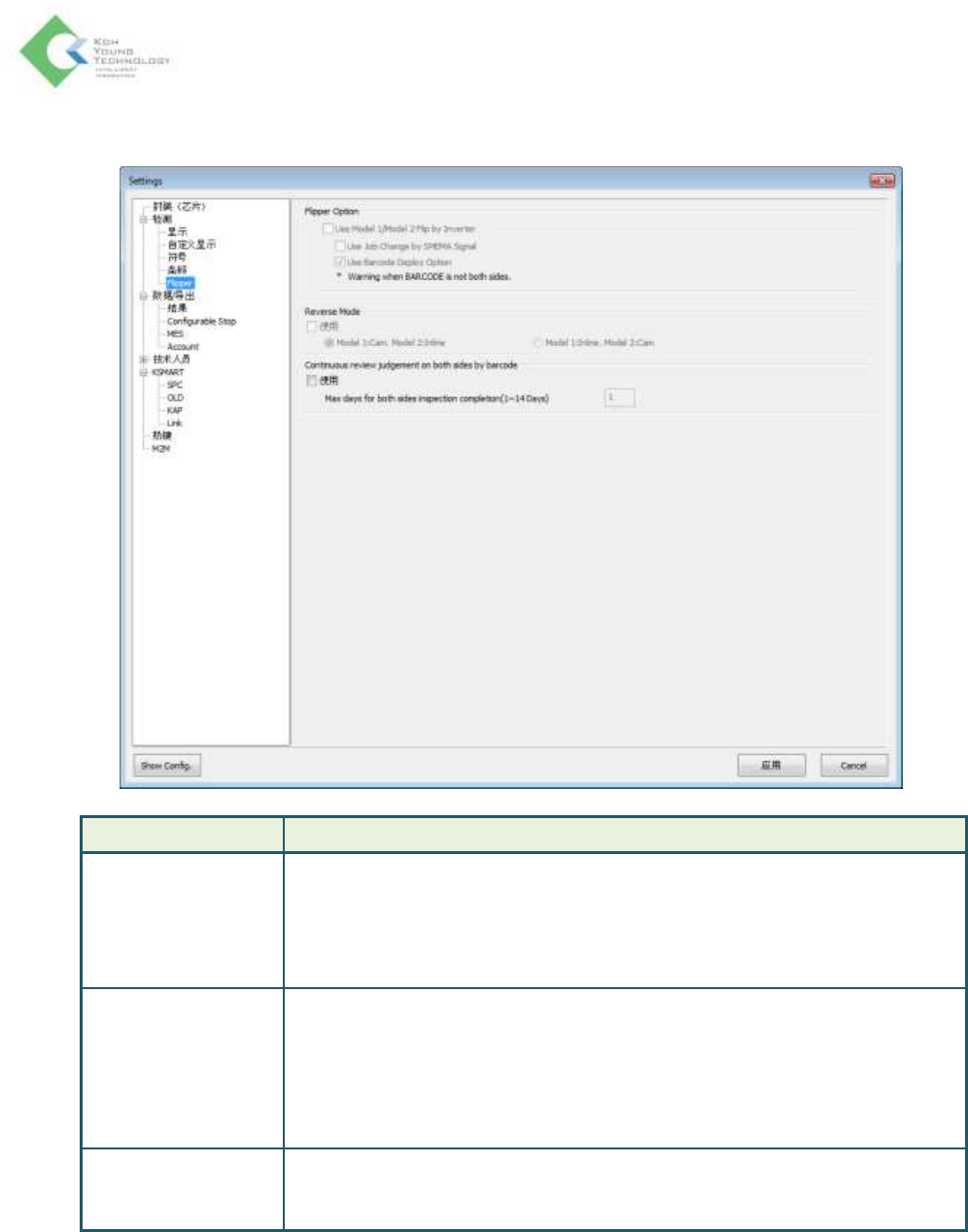 K oh Y oung Technolo g y Inc. 49 数据 / 导出 项目 说明 Display 显示所有结果(良品 + 不良品) 全部为良品时隐藏缺陷查看窗口 Save 保存不良结果 : 在下列项目中选择要使用的项目 - 不良结果 : 设置是否保存不良结果 - 可保存的最大 3D 图像数(按元件记) - 图像数据 : 设置是否保存 2D/3D 图像 保存良品结果 : 在下列项目中选择要使用的项目 - 良品结…