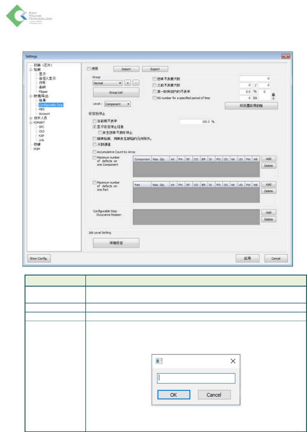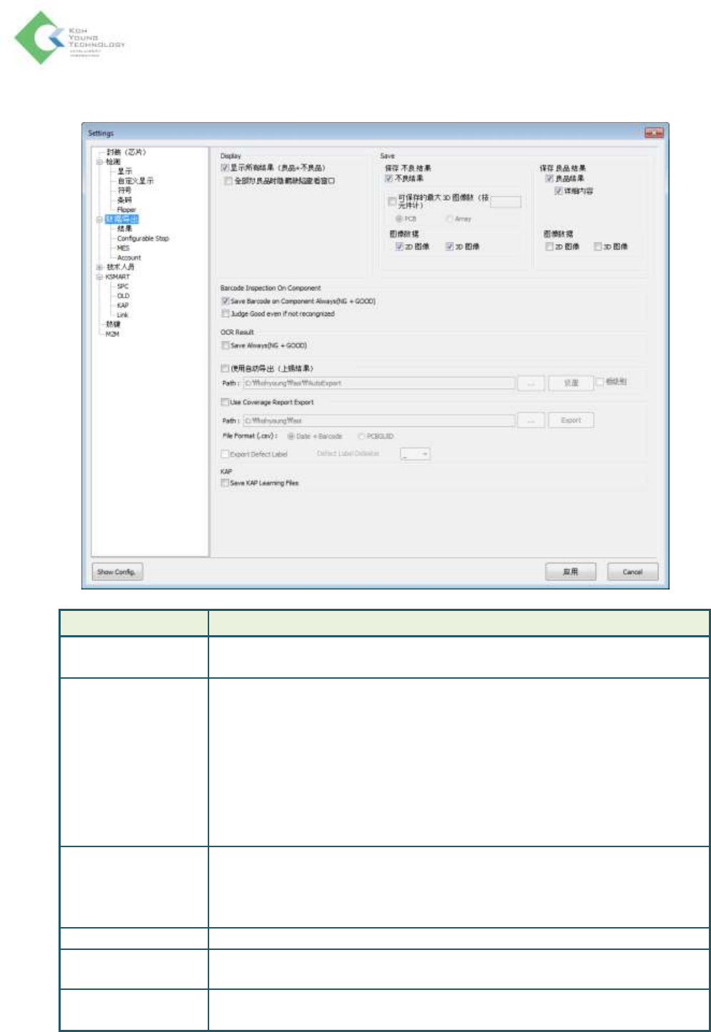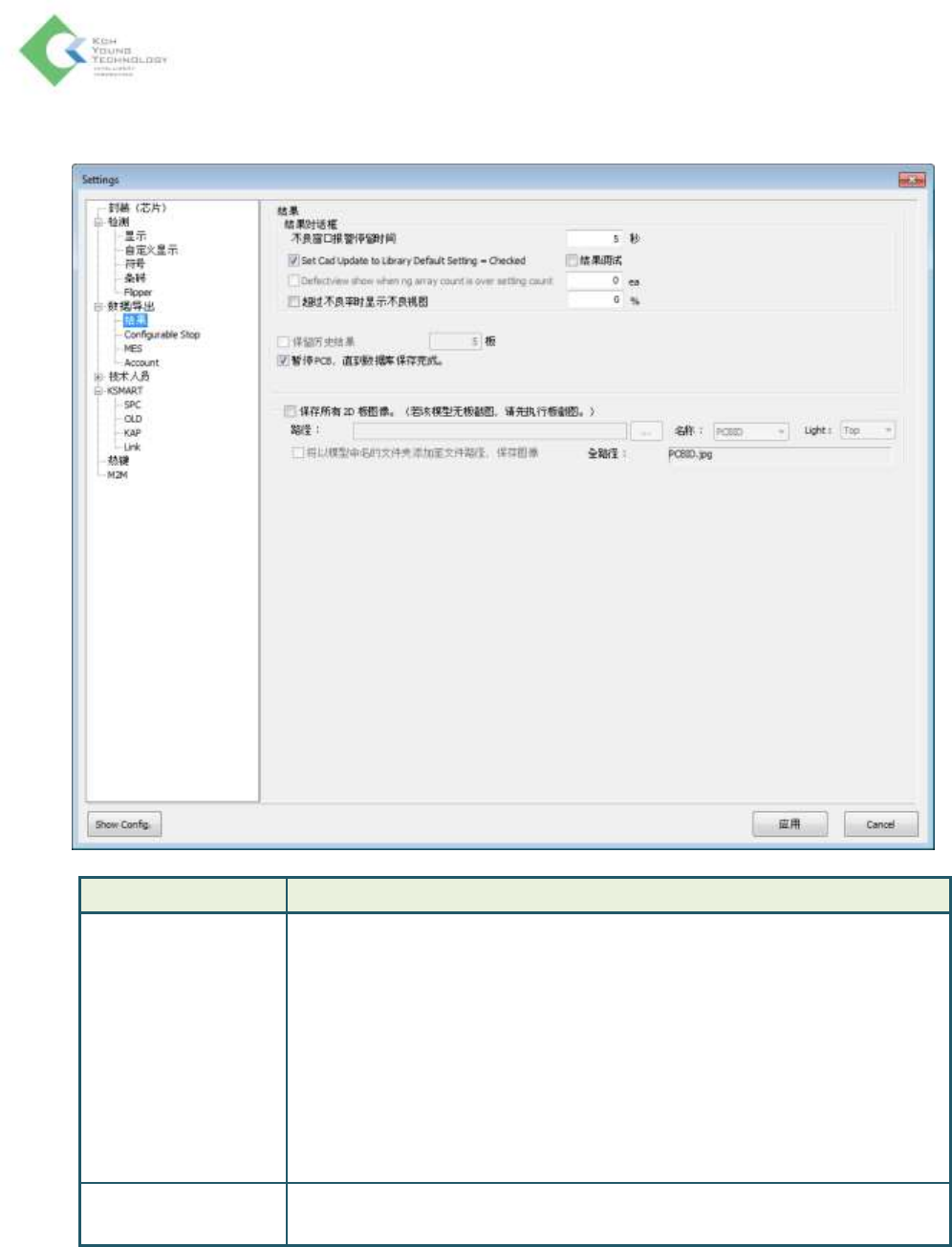 K oh Y oung Technolo g y Inc. 50 数据 / 导出 > 结果 项目 说明 結果 结果对话 框 : - 不良窗口报警停留时间 : 设置结果显示窗的弹出时间 - Se t C a d U p da t e t o Li b r a ry D ef a u lt S et t i ng = C he c k ed : 在 D e f ec t Vi e w 中使用 Se t Ca d 功能 时 可 设 …