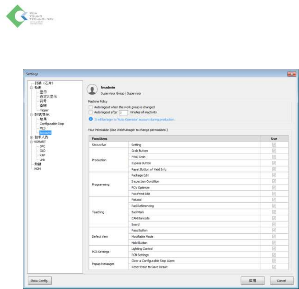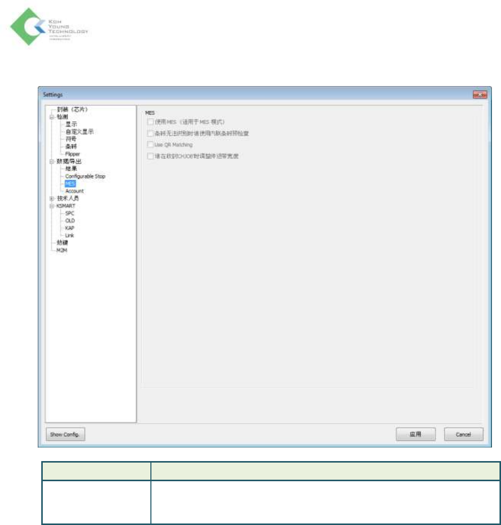 K oh Y oung Technolo g y Inc. 54 数据 / 导出 > MES 项目 说明 MES 使用 MES ( 适用于 MES 模式 ): 设置是否使用 MES 条码无法识别时请使用内联条码预检 查:无法识别条码时也使用 pre- check(PCHK)
