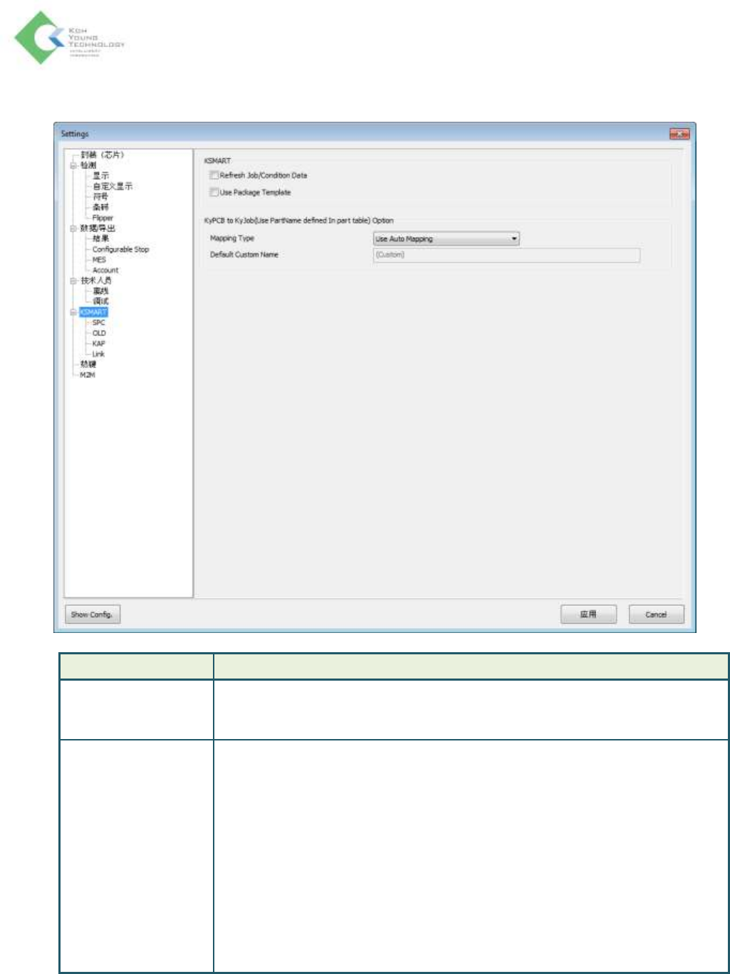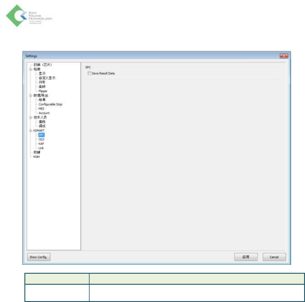 K oh Y oung Technolo g y Inc. 61 KSMART > SPC 项目 说明 SPC Save Result Data: 在使用 LM 的环境下,创建为了使用 SPC@KSMART 而需 要的 A OI 结果数据之后,将它传送到服务 器的选项