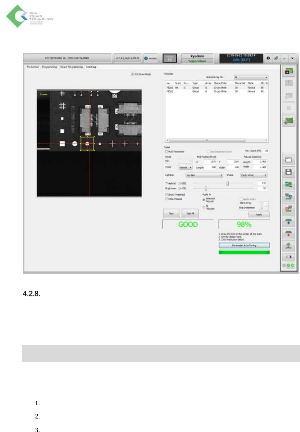 K oh Y oung Technolo g y Inc. 90 4. 参数校准正常时显示为“ GOOD ” ,且直接应用校 准后的设定值。 Array Group Fiducial Array Group Fiducial 为 按照 个别 Array 可以 设置 Grou p Fiducial 的补正范围的功能 。将使用原有的 Local Fiducial 按各别 Array 设置 Fiducial 的 补正范围的情况 下, 提出了检…