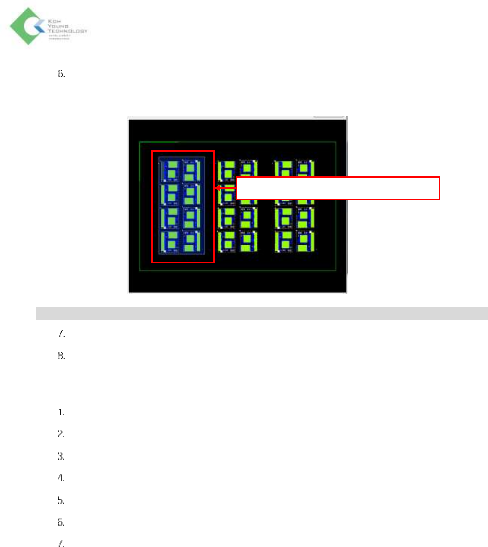 K oh Y oung Technolo g y Inc. 93 可选的校准 坏板标记校准 程序 点击选项选项卡。 界面左上侧的编程菜单中 点击 添加时会弹出添加新 对象窗口。 点击 Bad Mark 选项卡。 确认选项选项卡界面中间 X/ Y 坐标显示的坏板标记的位置。 在添加新对象窗口的 ROI 位置 ,输入坏板标记的坐标信 息。 在添加新对象窗口的 ROI 位置 ,输入坏板标记的尺寸和 连板号。 为了将 坏板 标记适用于所有连板,…