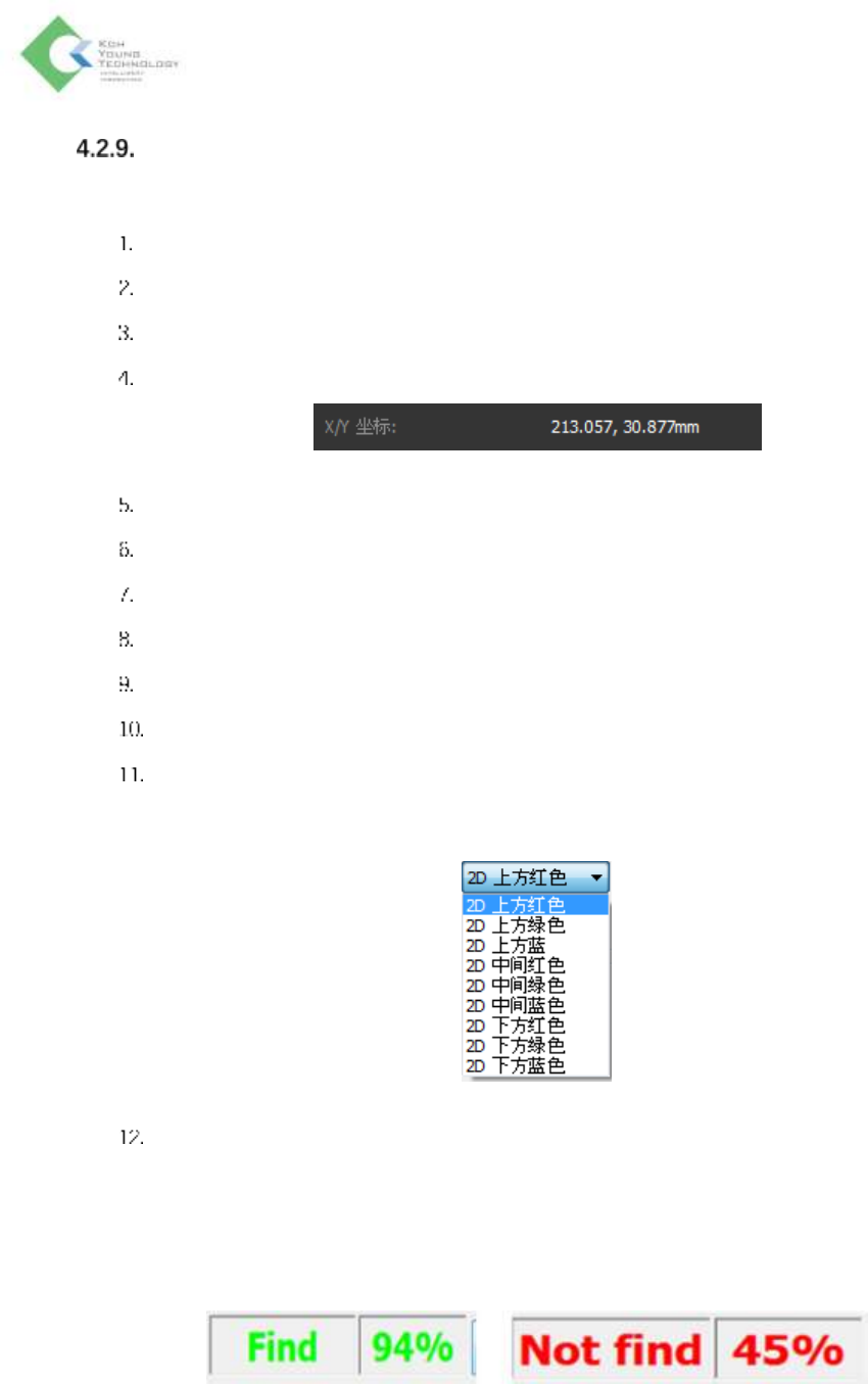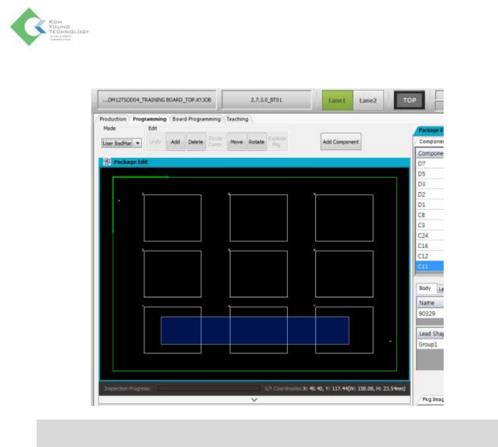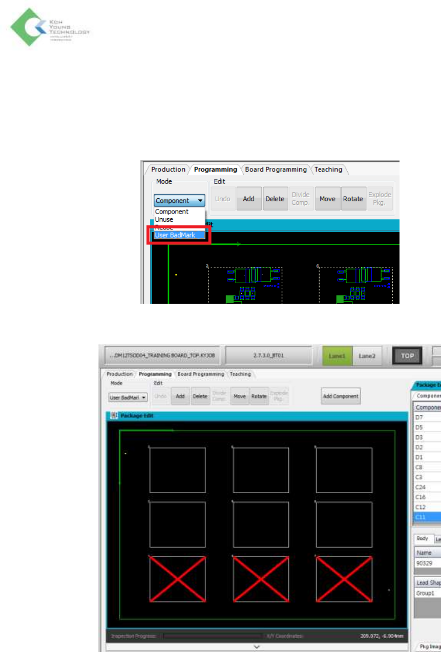 K oh Y oung Technolo g y Inc. 94 用户定义坏板标记 (Bad mark) 功能 以程式文件 (Job File) 连板中指定坏板标记连板,可以使该连板跳过 检测。 1. 请加载程式文件后,移动至编程 (Programmi ng) 栏。 2. 在鼠标动作模 式中选择 User BadMark 。 3. 若以拖动来选 择想要的连板,如下设为 User BadMark 。