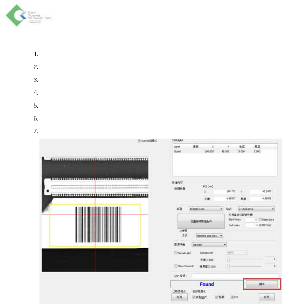 K oh Y oung Technolo g y Inc. 96 Cam Barcode 校准 程序 点击选项选项卡。 点击左上侧编辑界面中的添加,会 出现 添加新对象窗。 点击 Cam Barcode 选项卡。 设置条形码类型和位置。 从界面右下侧图像目录中选择适当的照明。 选择 Gray Erosion 形状。 点击测试按钮,识别 Cam Barcode 。