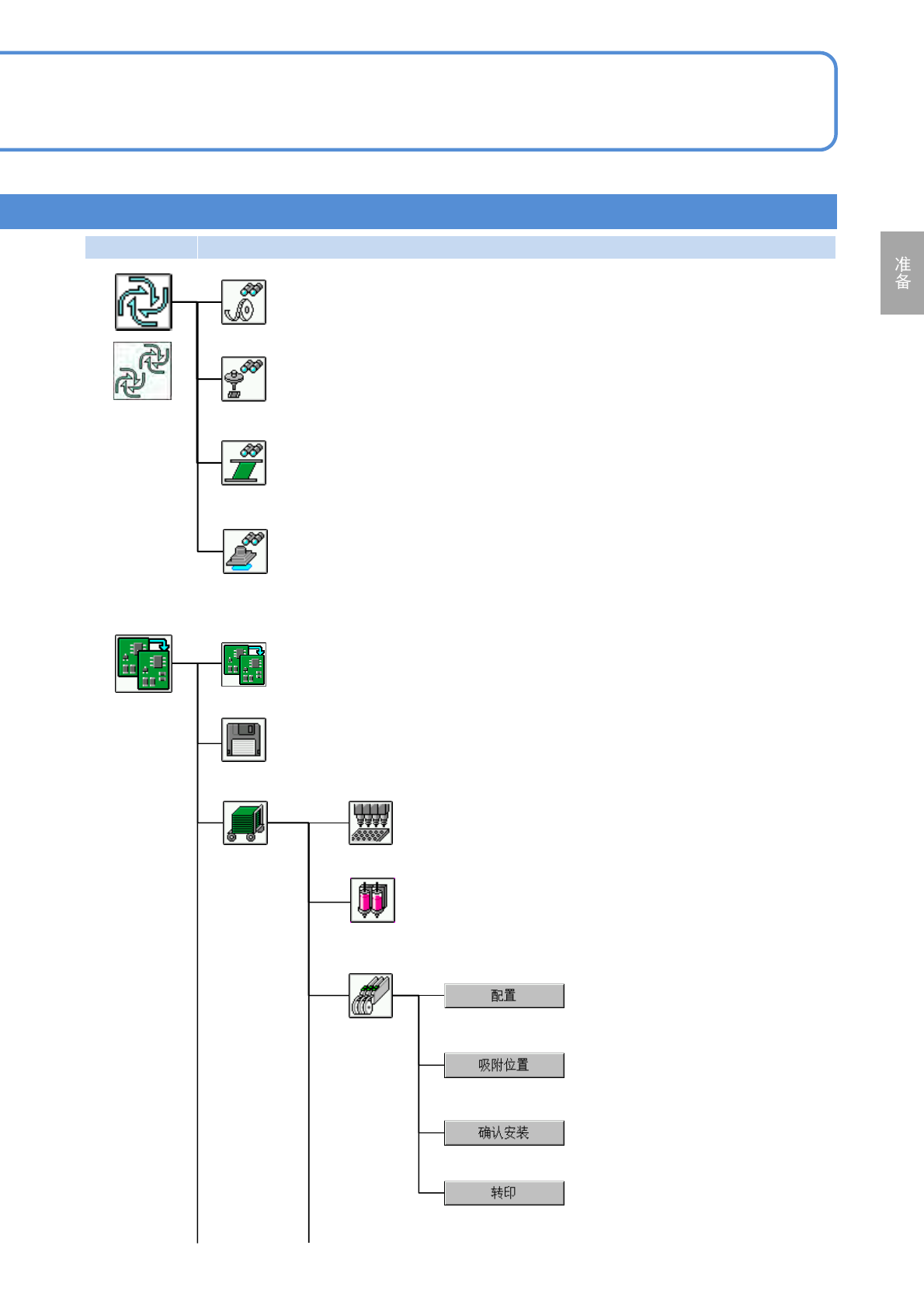 NPM-D3 EJM6DC-MB-02O-10 第 1 阶层 第 2 阶层 第 3 阶层 第 4 阶层 2-2-2 -7 菜单构成 4 工程师模式 2 确认托盘状态。 托盘 用颜色来显示生产数据和托盘状态。 根据各供料器地址来确认生产中的吸 着位置学习后的补正值。 准备菜单 准备零部件 传送带 进行基板支撑销单元的更换动作。 显示基板位置,从各位置进行传送。 调整轨道宽度。 事先计算生产计划所需的元件消耗量 。 生产计划 显示各基台的运…