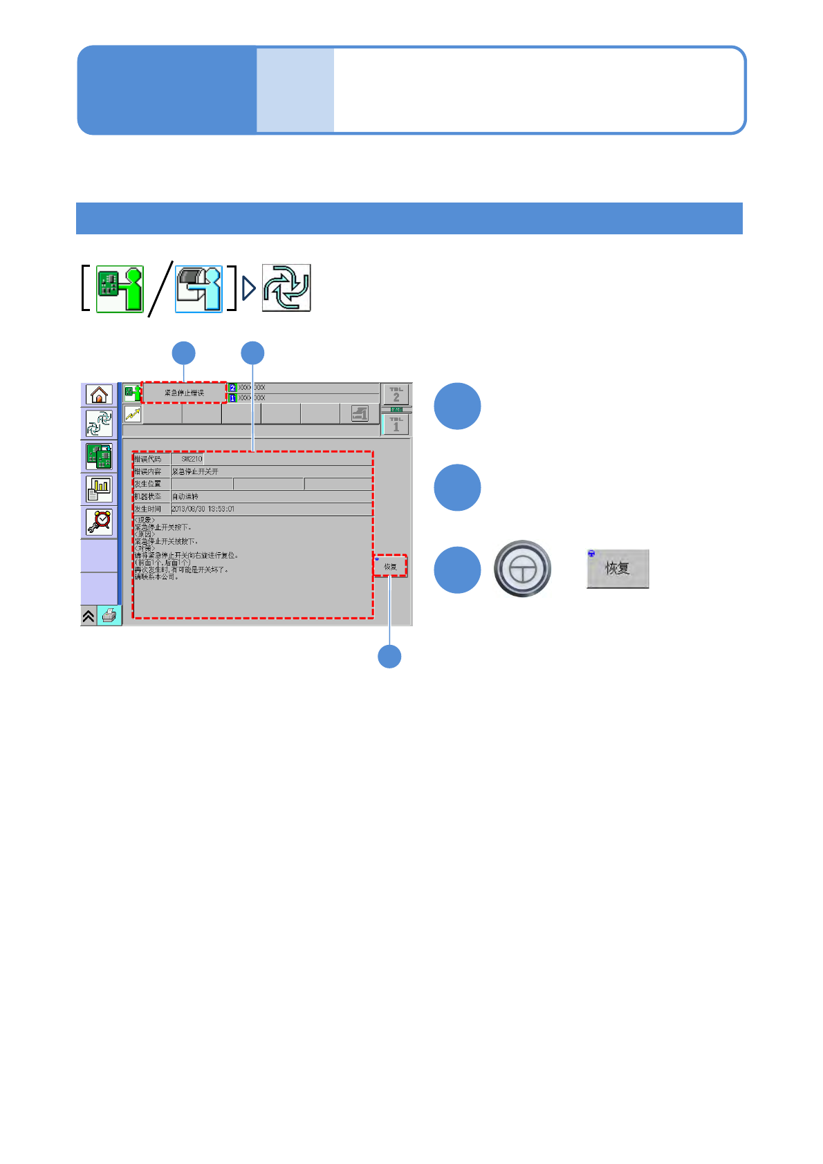 NPM-D3 EJM6DC-MB-03O-0 8 生产 3-1-3 操作篇 3-1-3 错误停止与恢复 错误停止后恢复生产 在这里对发生错误时恢复生产的方法 进行说明。 ●在生产中显示错误停止画面。 1 1 + 2 3 2 确认错误内容、帮助等信息后, 采取对策 3 ( 转为可进行生产的轨道将恢复生产 ) 发生错误后,将显示错误停止画面