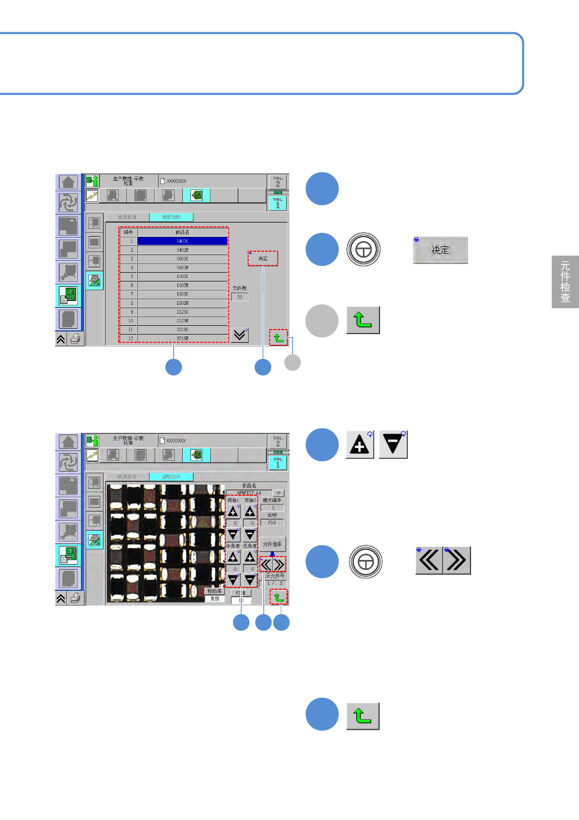 NPM-D3 EJM6DC-MB-04O-05 生产数据 和校正 校正基板的摄像 5 操作篇 4-3-2 4-3-2 -9 1 ■模式为说明时 1 ( 显示确认图像状态的元件选择画面 ) 2 3 5 4 输入图案编号和说明 2 3 ( 在画面上显示与输入的数据一致的元件 信息 ) 4 + ( 检查头移动至所选择的元件位置) 5 ●变更同轴 1 /同轴 2 /中角度/低角 度 的各照明値,调整到适合检查的图像 状态。 ●变更各照明值,同时…