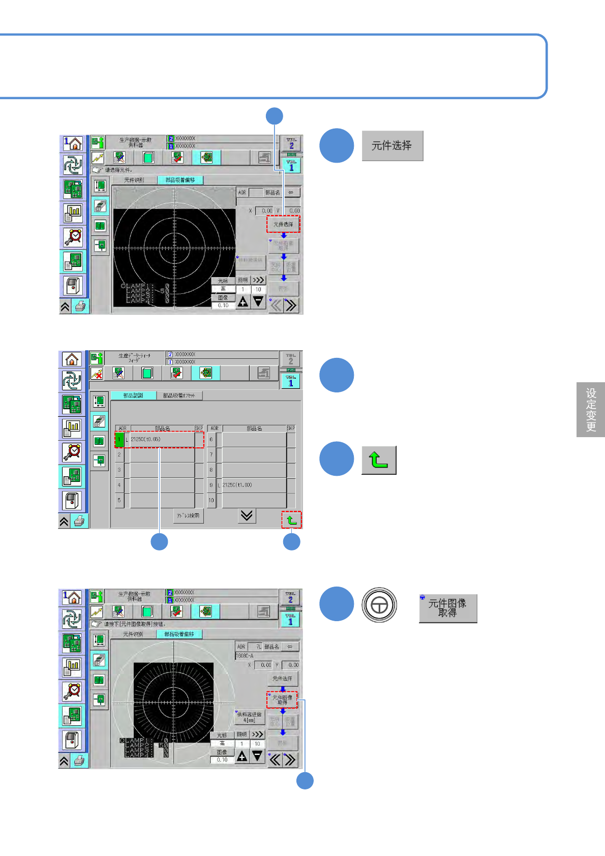 NPM-D3 EJM6DC-MB-06O-0 9 生产数据 校正 操作篇 6-2-6 6-2-6 -1 元件吸着偏移校正 1 进行吸着位置的校正。本功能还可用 于吸着位置与中心位置不同的元 件。 指定元件的中心,然后指定实际的吸 着位置。 ● 都需要进行。 C A B G E F D ADR 配置有供料器的插槽编号 ( 地址编号、配置位置 (L/R)) X,Y X 、 Y 的移动量 执行供料器的供给动作 切换进行调整的照明 指定图像的移…