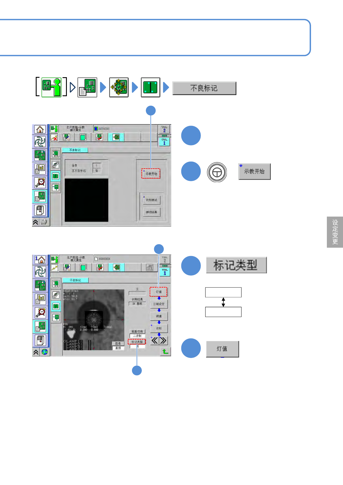 NPM-D3 EJM6DC-MB-06O-09 6-2-10 -2 3 3 4 4 当不良标记为白色 时 白 黒 ●选择标记类型。 当不良标记为黑色 时 1 2 把基板设置在基板传入口 + 基板上有不良标记时确认标记识别, 对其确认方法进行说明。 2 ( 基板被搬入到贴装基台,且识别照相 机移动到不良标记位置上。 )