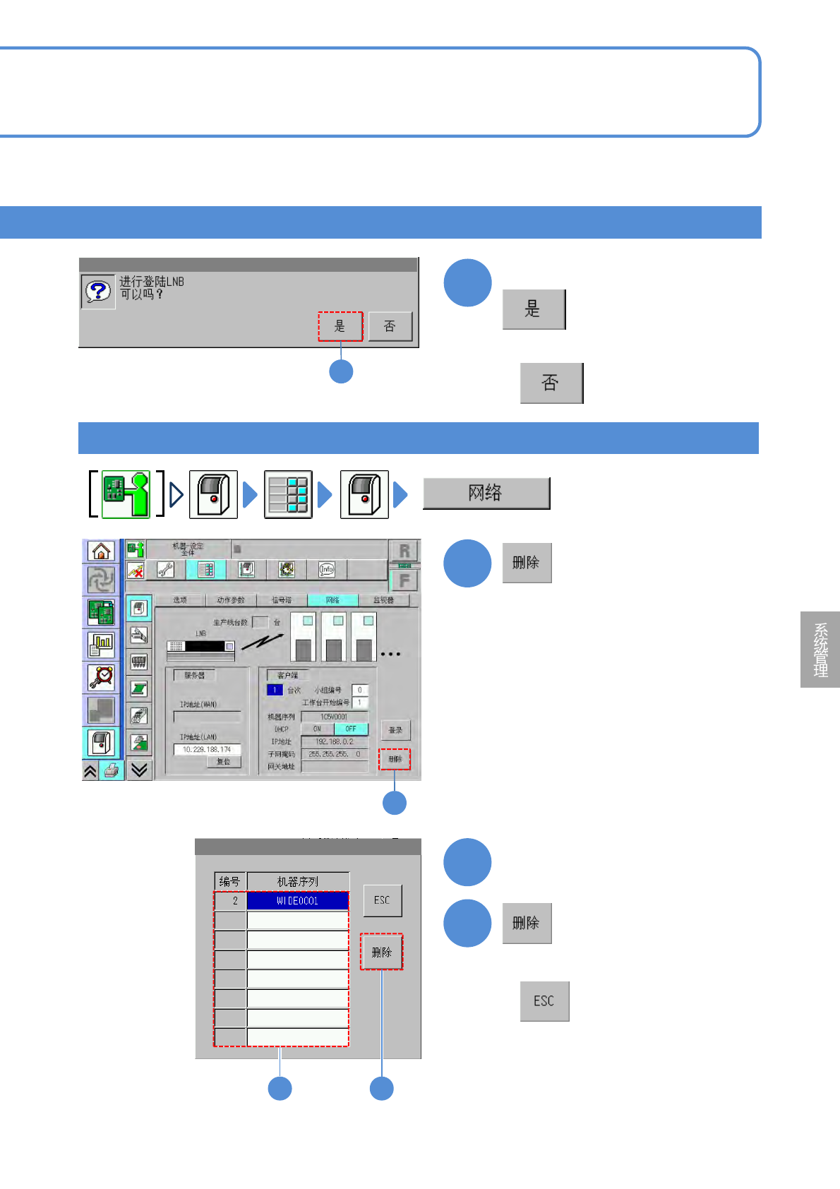 NPM-D3 EJM6DC-MB-07O-12 7-1-4 -2 3 3 3 1 1 2 3 2 选择设备编号 确认提示 ( 显示登录在 LN B 的设备一览 ) 删除设定 ■不登录时 ■不删除时