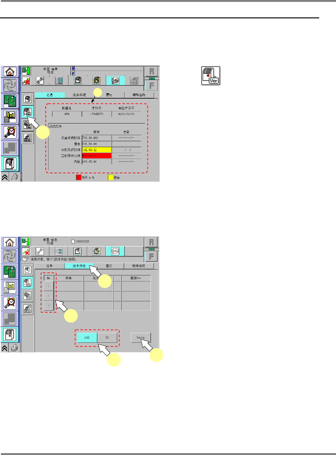 NPM-D 维修篇 1.8 更新 Page 1-42 EJM1DC-MB-01M-00 1.8 更新 1.8.1 机器系统的更新 版本信息 1 按 。 a. ‘ 信息 ’ 显示机器名、机器序列号、制造年月 日。 并且显示各系统软件的版本和更新日 期。 版本升级信息 1 按 [ 版本升级 ] 。 2 选择保存着要更新版本的系统软件之 保存处。 3 选择要更新版本的系统软件。 ∗ 如果保存处没有更新版本的对象软件 ,无法按 下。 4…