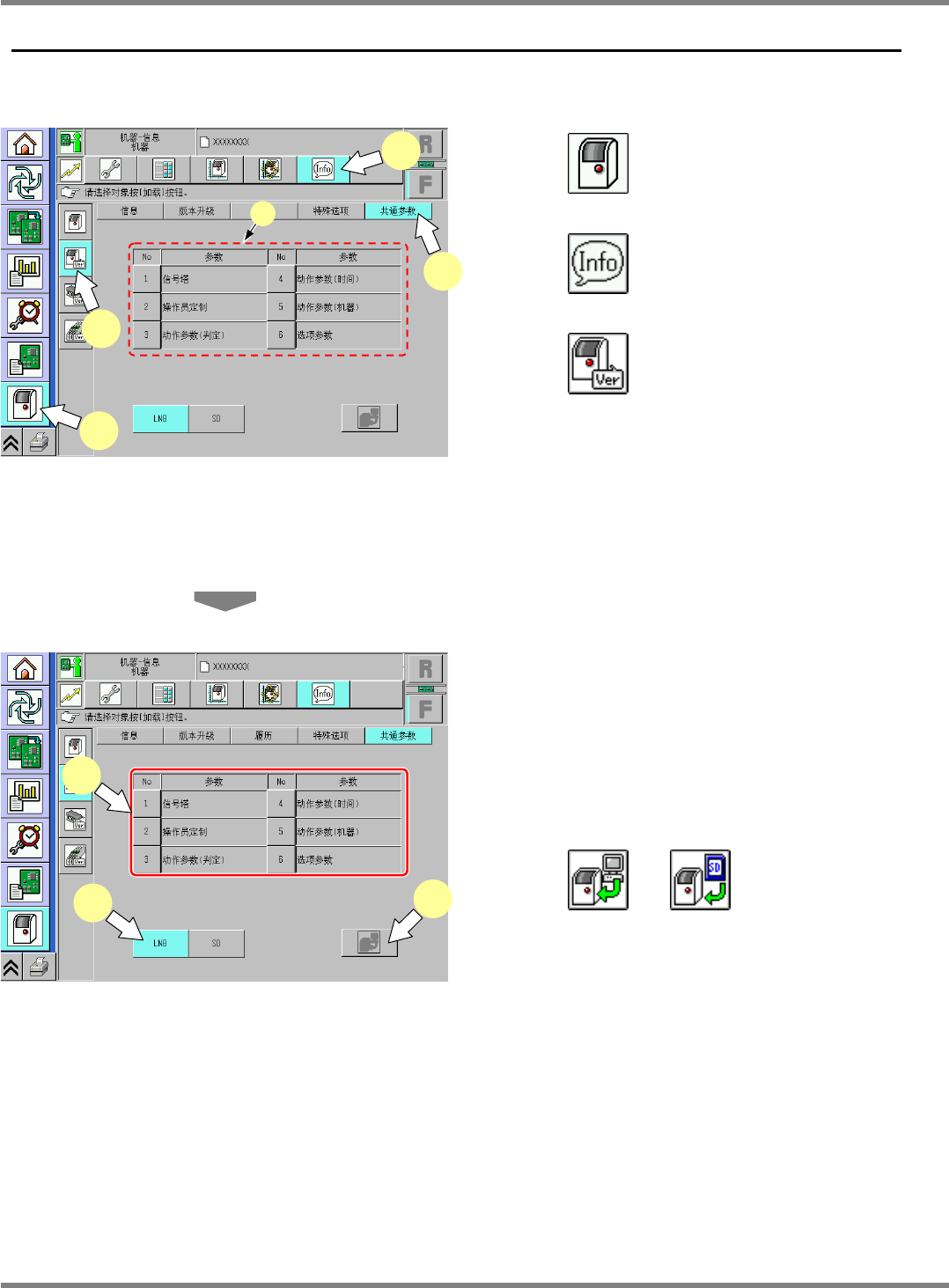 NPM-D 维修篇 1.10 共通参数 Page 1-52 EJM1DC-MB-01M-00 1.10 共通参数 通过本项功能,能够从 LNB 或 SD 中读取所选择的共通参数。 1 按 。 2 按 。 3 按 。 4 按 [ 共通参数 ] 。 a. ‘ 参数 ’ 能够读取信号塔、 操作员定制、 动作参数 ( 判定 ) 、 动作参数 ( 时间 ) 、动作参数 ( 机器 ) 、选项参数。 5 按 [No] 。 选择对象参数。 6 按 [L…
