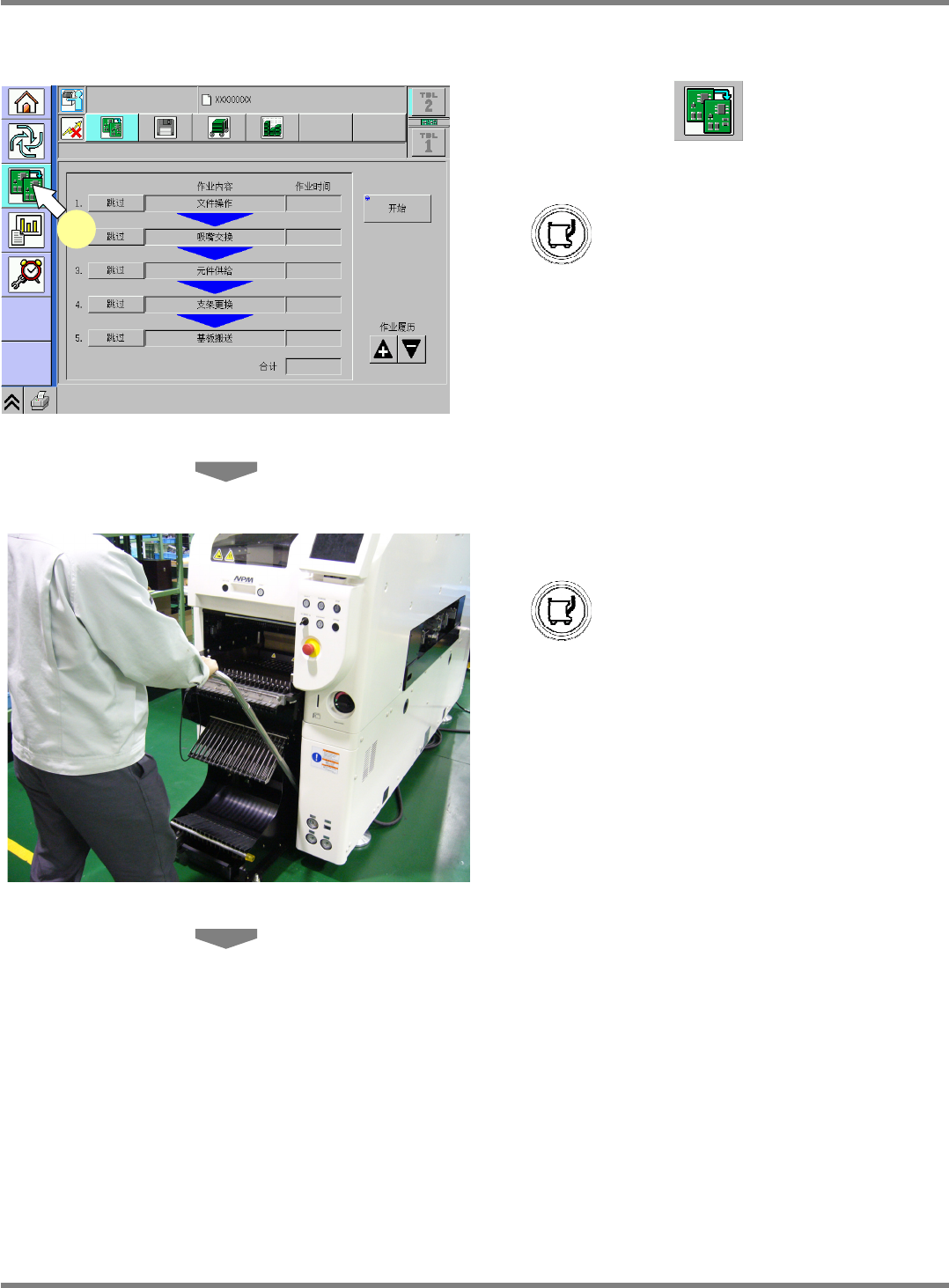 NPM-D 维修篇 2.2 交换台车 ( 选购件 ) 的拆卸和安装 Page 2-8 EJM1DC-MB-02M-00 安装步骤 1 按操作面板的 。 • 将会显示程序转换的菜单。 • 将会亮灯。 ∗ 上述的灯光发亮代表可安装交换台车 。 2 设置交换台车。 • 从亮灯变成闪炼。 ∗ 代表可以把交换台车固定在主体设备 中。 ChangeWorkState- 01C00 1