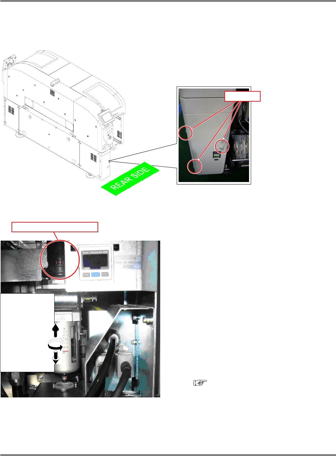 NPM-D 维修篇 3.1 调节器装置的检查 [ 开始作业时 ] EJM1DC-MB-03M -00 Page 3-5 清扫吹气压力、线性照相机空气压力不在规定值范围时 1 打开本机前面下部的盖。 ∗ 请使用六角扳手拆卸 3 处螺栓。 2 用调节器旋钮将数值调整到规定范围 内。 ∗ 清扫吹气压力、线性照相机空气压力 的调节旋 钮请参照左图。 操作方法都是相同的。 ∗ 压力调整请往上升方向进行。 若往下降方向调整,压力可能降到比 当初…