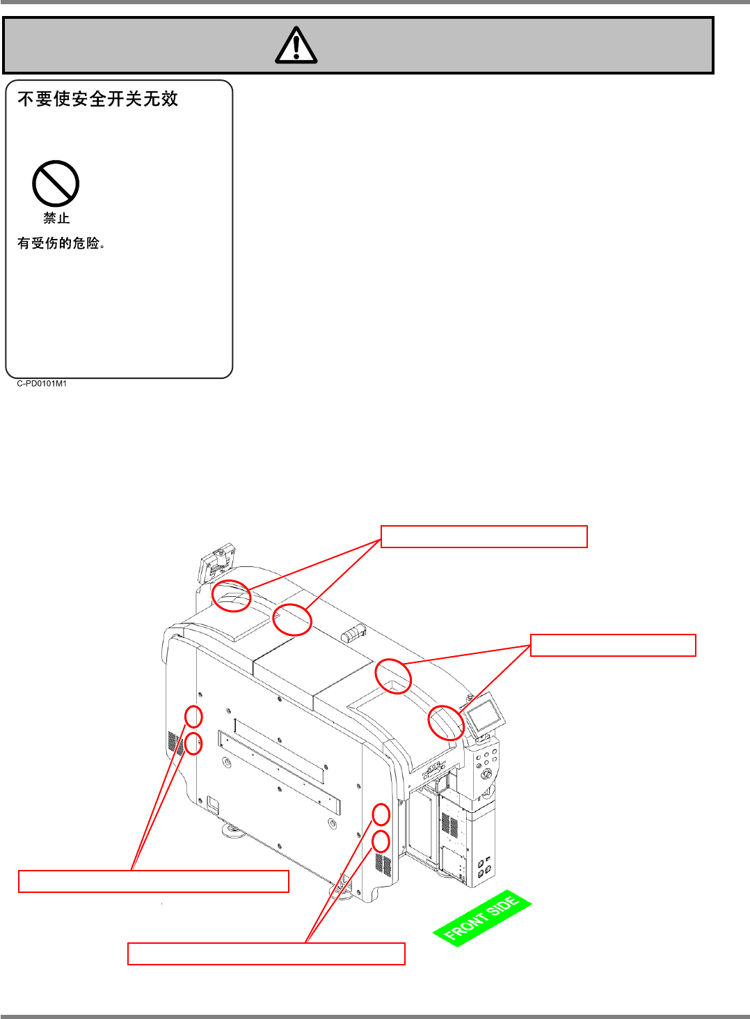 NPM-D 安全注意事项 Page S-2 EJM1DC-SF-01N-00 z 关于安全开关的位置 本机在前面安全盖和后面安全盖上共有 8 处安全开关。 前面安全盖的安全开关 後后面安全盖的安全开关 后面供料器工作台盖的安全开关 前面供料器工作台盖的安全开关 危险