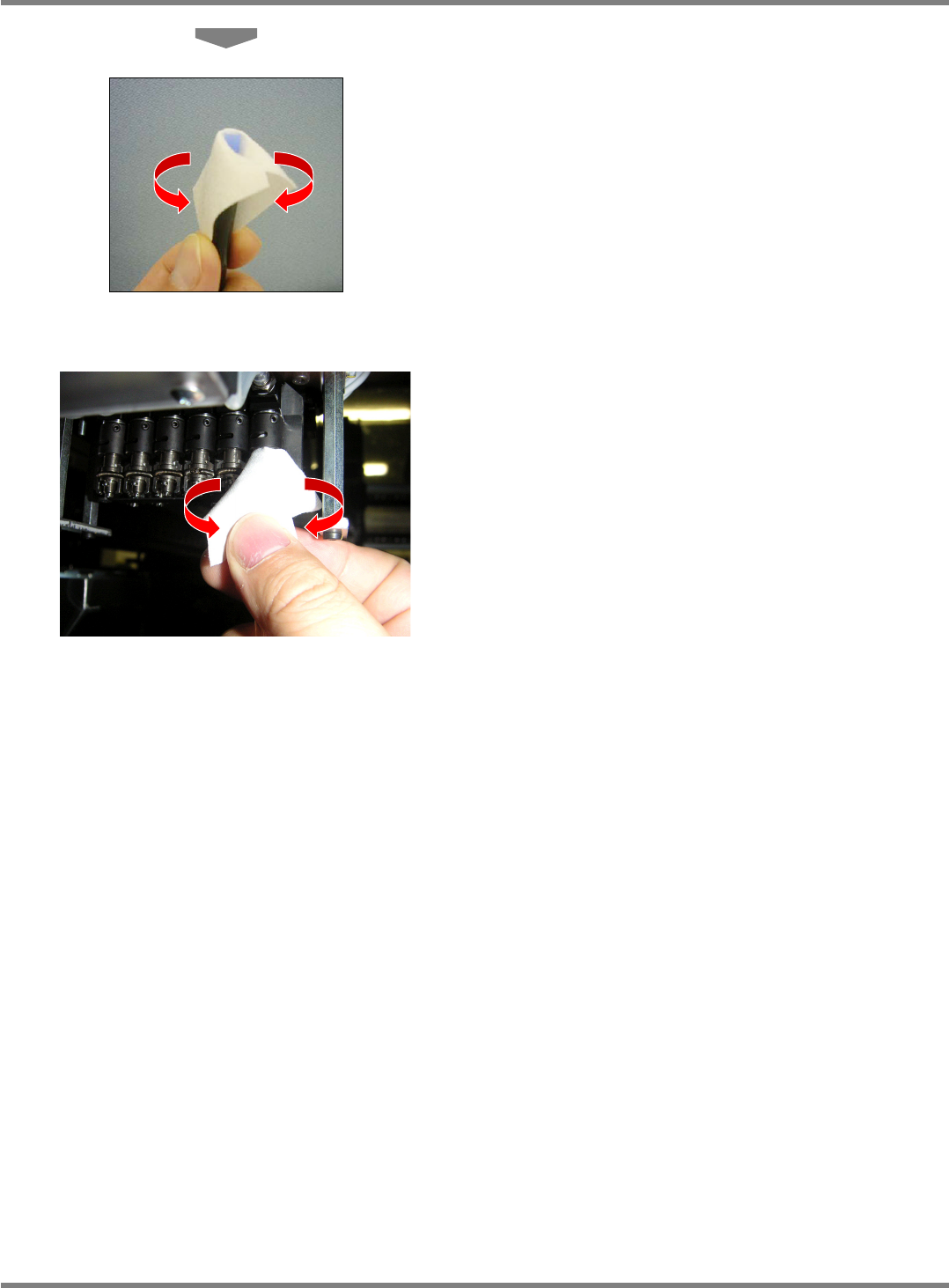 NPM-D 维修篇 4.2 吸嘴座的清扫 Page 4-12 EJM1DC-MB-04M-00 4 将清洁纸的端边对准手抓的部分来折 回。 ∗ 成为如照片所示的状态,即完成准备 工作。 5 将清扫工具插到吸嘴座轴里, 往吸嘴旋 转方向转 2 ~ 3 圈后进行清扫。 ∗ 若清洁纸弄脏,应及时更换。 EJM8A-032P [12 吸嘴清扫状态 ] EJM8A-030P