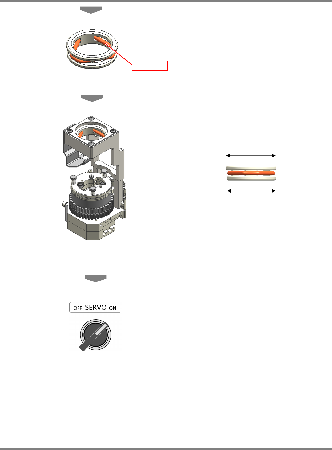 NPM-D 维修篇 6.4 O 型环 ( 点胶头 ) 的更换 ( 选购件 ) EJM1DC-MB-06M -00 Page 6-11 9 更换 O 型环。 10 复原注射头架。 ∗ 在复原之际,请注意注射头架的上下 方向。请 将直径较大的一方安装在上面。 ∗ 请在注射头架的外围薄涂一层润滑脂 (LCG100) 。 11 拧紧螺钉 (4 处 ) 后,固定盖。 12 关闭安全盖。 13 将伺服开关置于 ON 。 O 型环 φ 36 φ 35