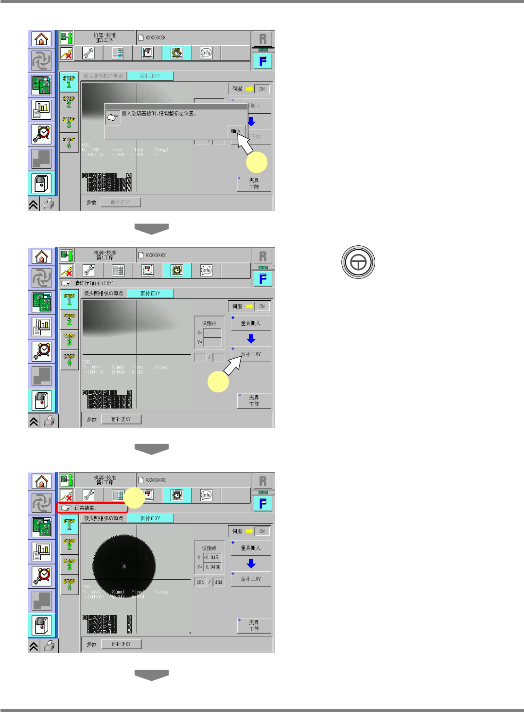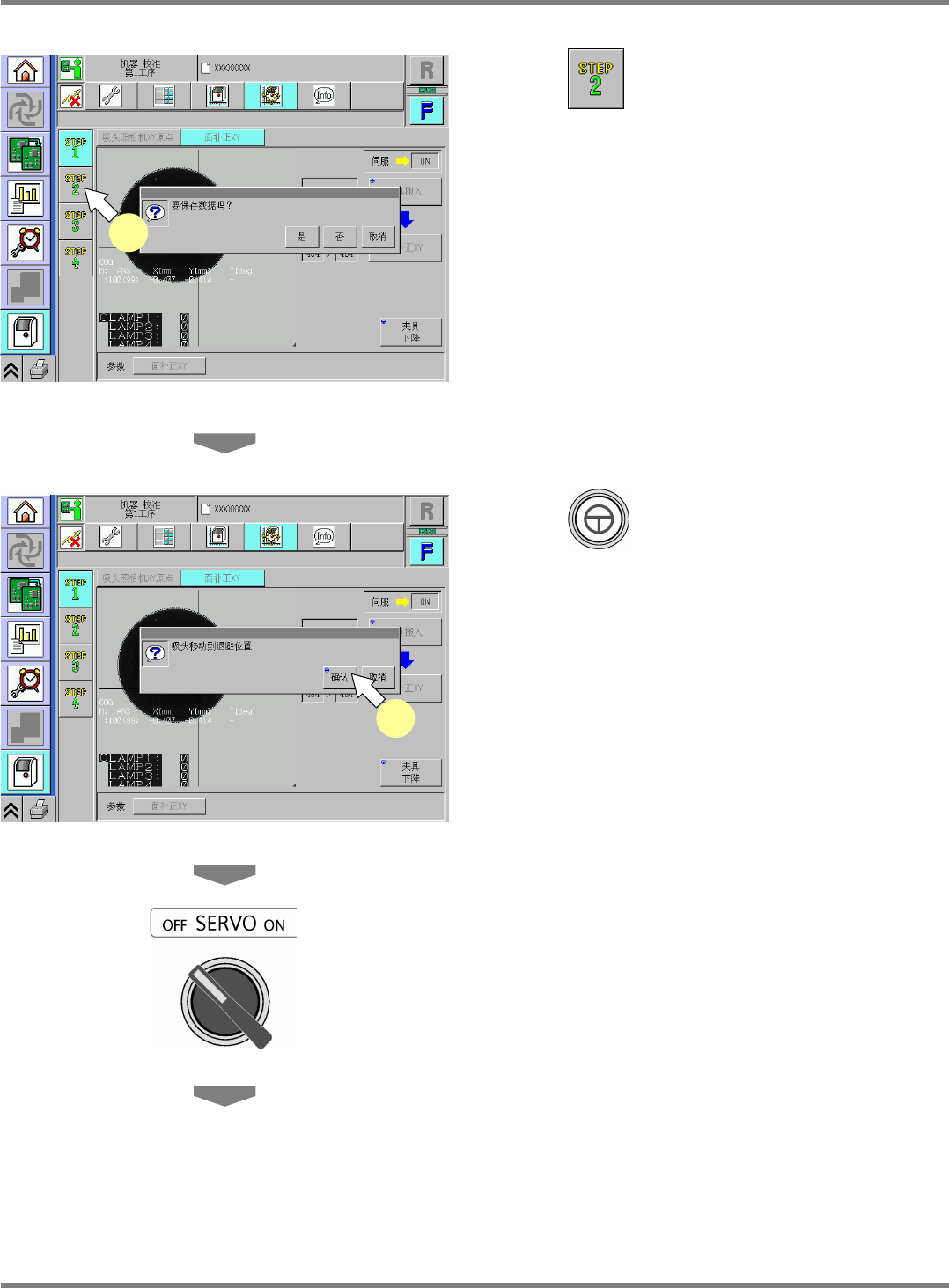 NPM-D 维修篇 9.3 面补正 XY Page 9-12 EJM1DC-MB-09M-00 15 按 。 • 不仅是下一项目,从此画面换到其它 画面时都 会显示确认是否保存数据的画面。 ∗ 若要保存通过校准获得的数据,请按 [ 是 ] 。 • 若按 [ 否 ] , 将会进行原点复归, 通过校准获得的 数据将被失掉。 • 上述操作完毕后,画面将会转换。 16 按 + [ 确认 ] 。 • 吸头将会移动到退避位置。 17 将伺服开关置于…