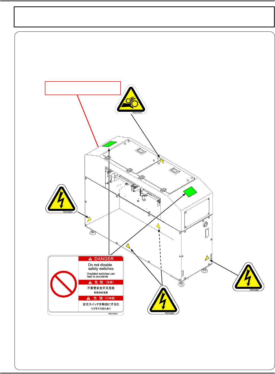 NPM-D 安全注意事项 EJM1DC-SF-02N-00 Page S-25 产品上的安全标牌 NPM-D 传送带 ( 选购件 ) 警告标牌 如下图所示,本机器贴有警告显示标 牌。请遵守标牌的指示。 标牌脱落时,请参照 Parts List ( 元件一览表 ) 的标牌型号,向本公司订购并 将其重新粘贴到正确的位置 。 传送带 R (N-CONR)
