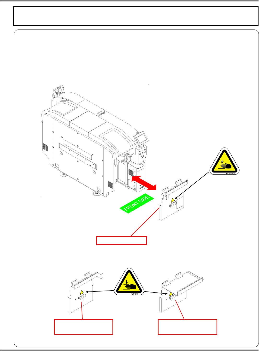 NPM-D 安全注意事项 EJM1DC-SF-02N-00 Page S-33 产品上的安全标牌 安全盖 ( 选购件 ) 警告标牌 如下图所示,本机器贴有警告显示标 牌。请遵守标牌的指示。 标牌脱落时,请参照 Parts List ( 元件一览表 ) 的标牌型号,向本公司订购并 将其重新粘贴到正确的位置 。 安全盖的警告表示标牌粘贴位置 ∗ 在安全盖 ( 后侧 ) 也同样粘贴了警告标牌。 安全盖 ( 前侧 ) EJM9B-AA0…