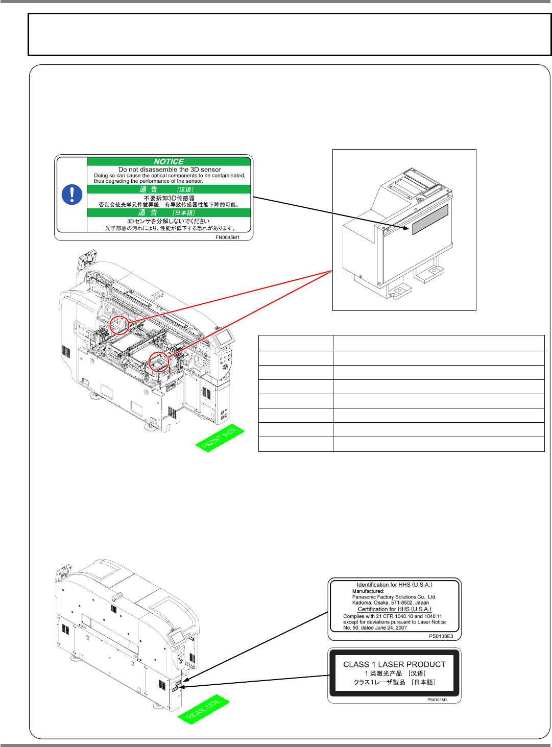 NPM-D 安全注意事项 Page S-44 EJM1DC-SF-02N-00 关于 3D 传感器 ( 选购件 ) 的使用 在 3D 传感器 ( 选购件 ) 部上粘贴的安全标牌 IEC 警告标牌 (3 种 ) 通知标牌 (1 种 ) 要求 搬运 3D 传感器时如果将其掉下,会 有受伤的危险,请用双手处置。
