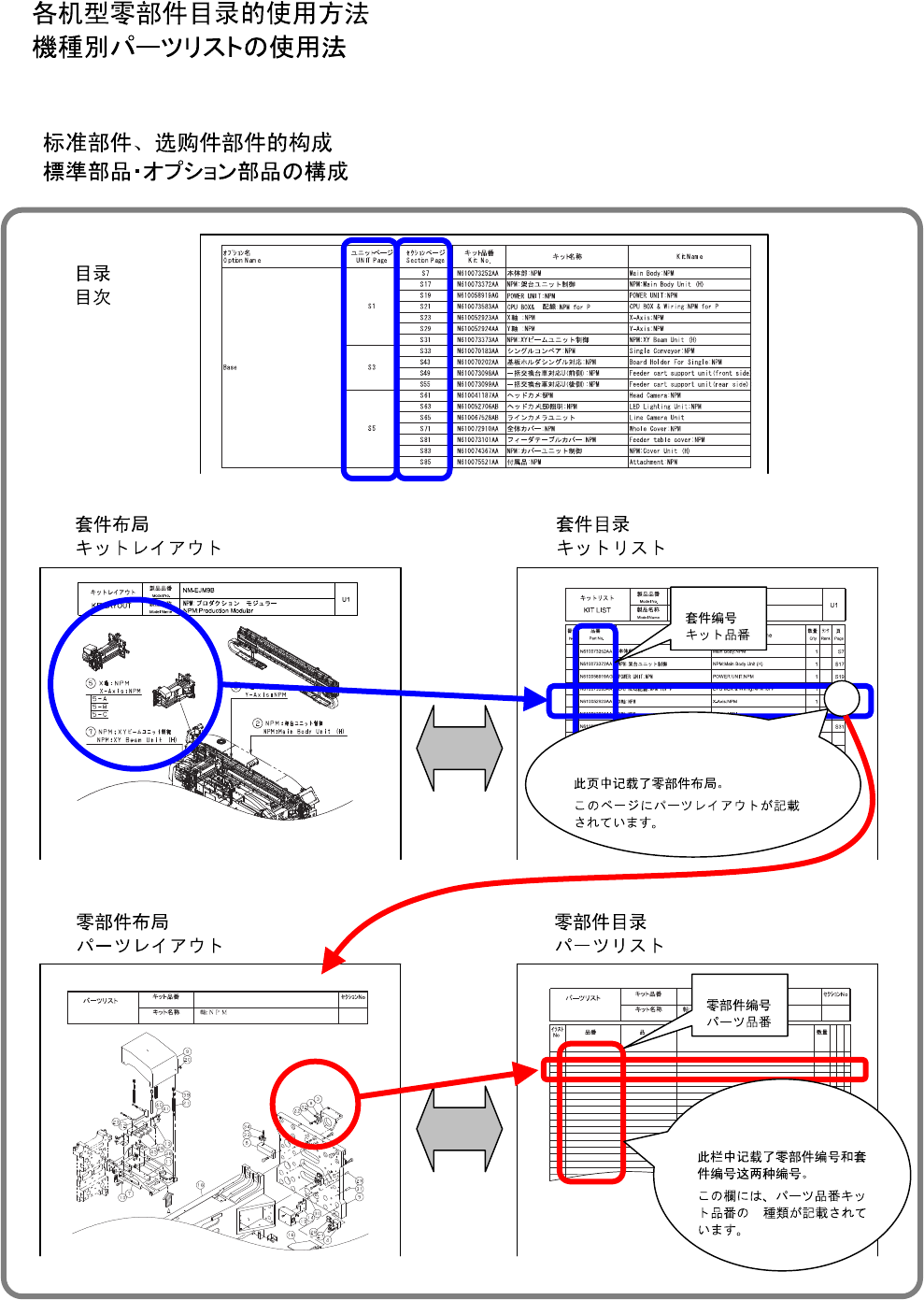 Page 2 ■ In the part s list, the three word s “model,” “kit,” and “part” means different p arts as the figure below . ※ The p arts list for t ape feeder is provided only for those who p urchased the tape feeder . ■ 在零…
