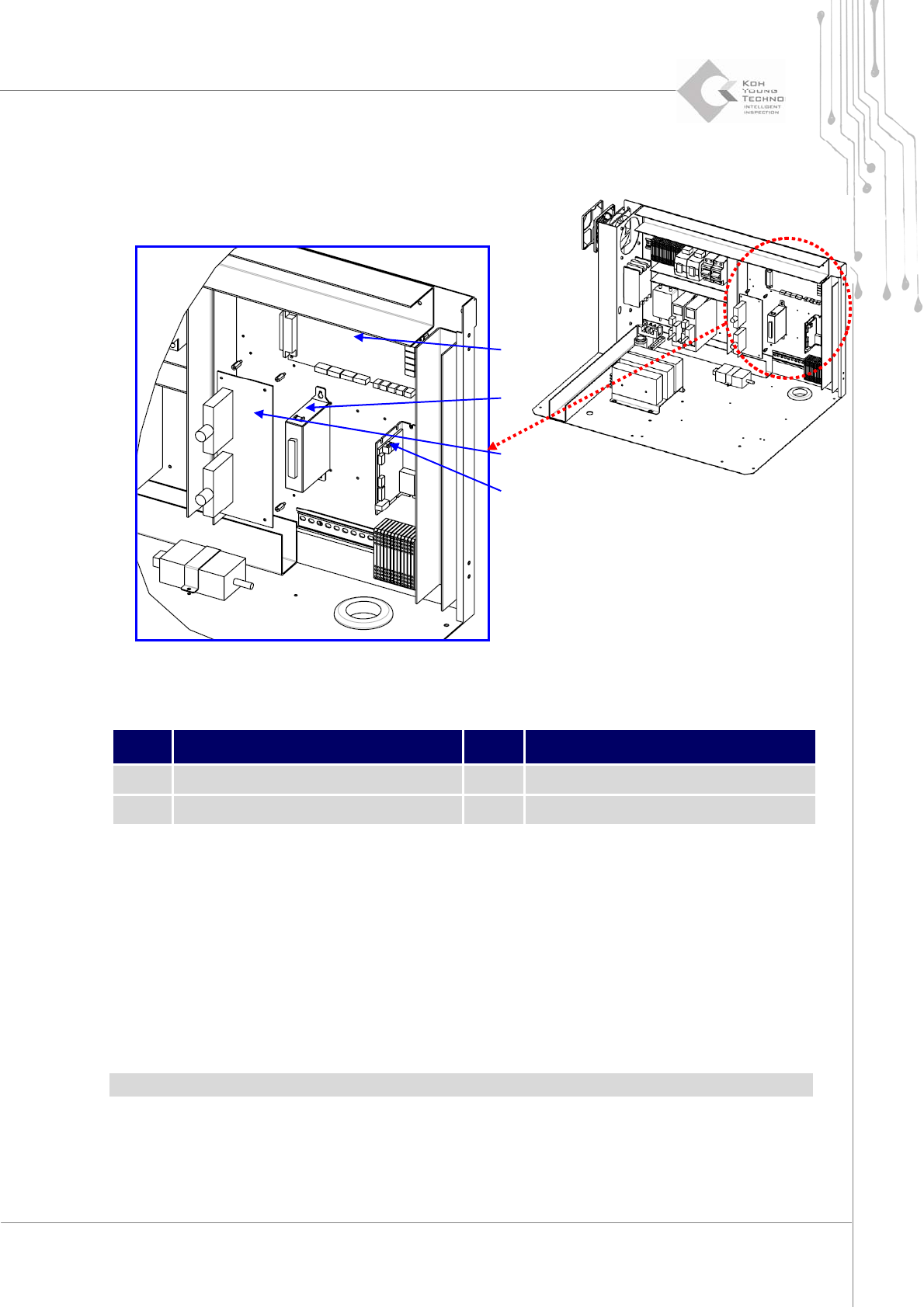 50 | KY -8030 2 3D Solder Paste Inspec tion System V ersion 1.0 K OH Y OUNG T ECHNOLOGY I NC . 1.2.16.3. STMC Board and PZT Amplifier Change Figure 1-19. STMC Board and PZT Amplifier Item Description Item Descr…