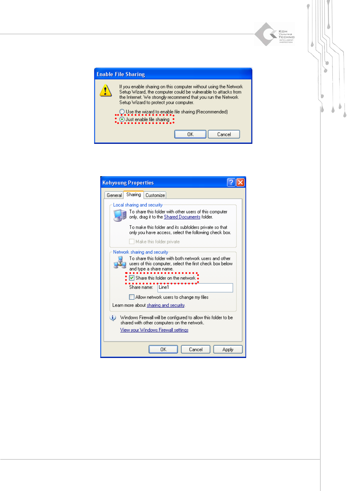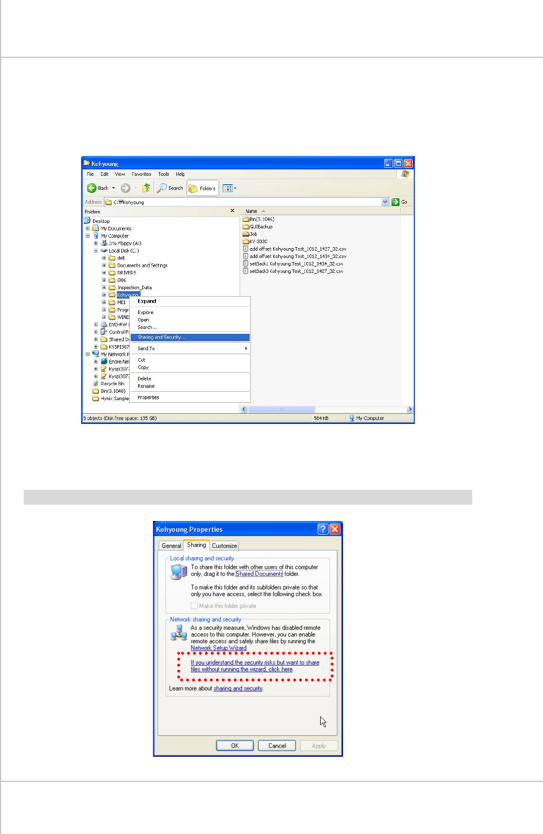 76 | KY -8030 2 3D Solder Paste Inspec tion System V ersion 1.0 K OH Y OUNG T ECHNOLOGY I NC . 3.5.3. S HARING F OLDER 1. Select “Sharing and Security” by clicking the right button of the …