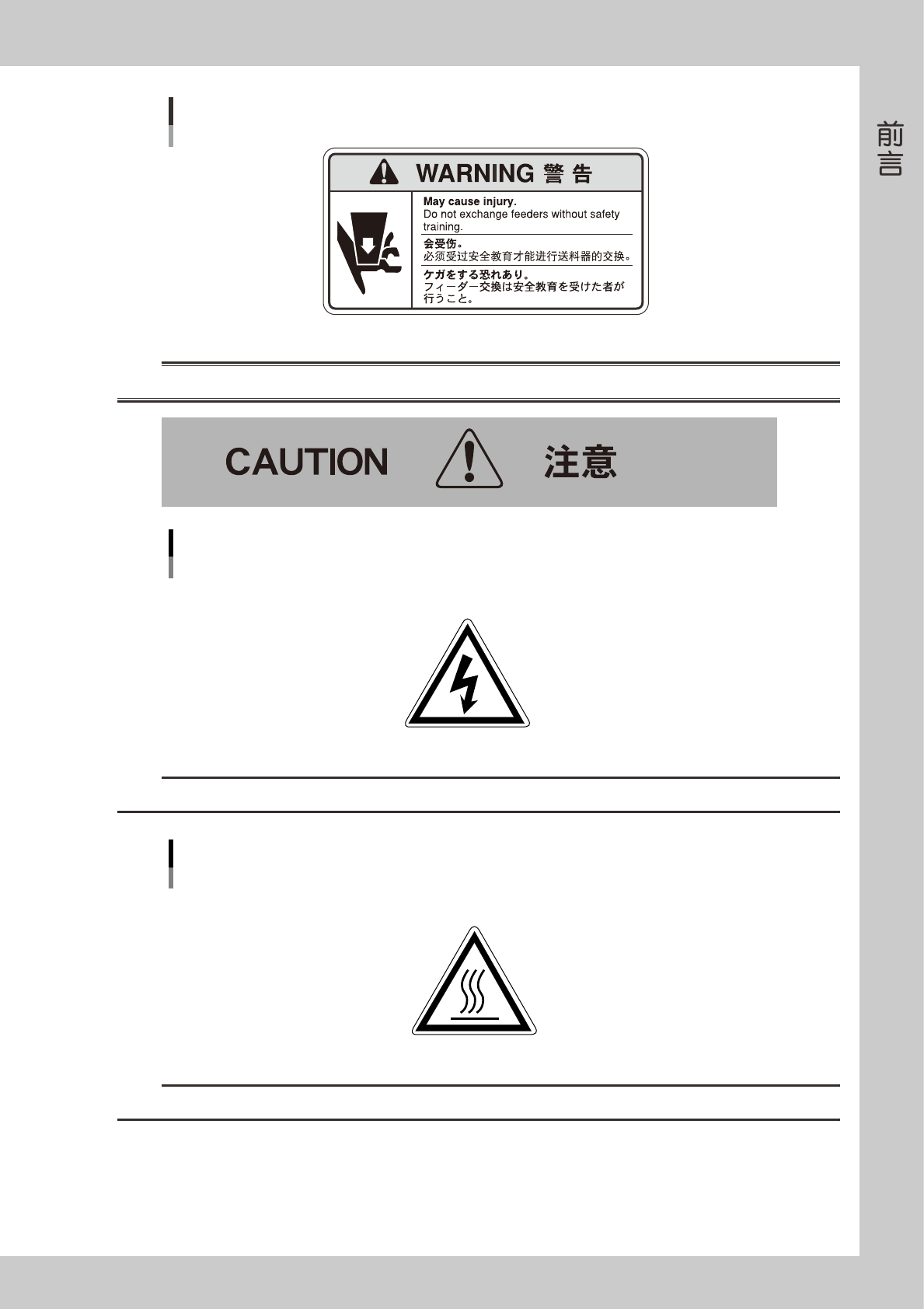 vii 有受伤的危险 22 0 0 1- G 0 -2 S w 警告 更换送料器必须由接受过安全教育和正确操作机器的培训课程的人员进行。 高圧注意 有触电的危险 22 0 0 1- G 0 -1 C c 注意 触摸机罩内的电源部,会有触电的危险。 高温注意 有烫伤的危险 22 0 0 1- G 0 -1 D c 注意 可动部的马达处于高温状态,切勿触摸。
