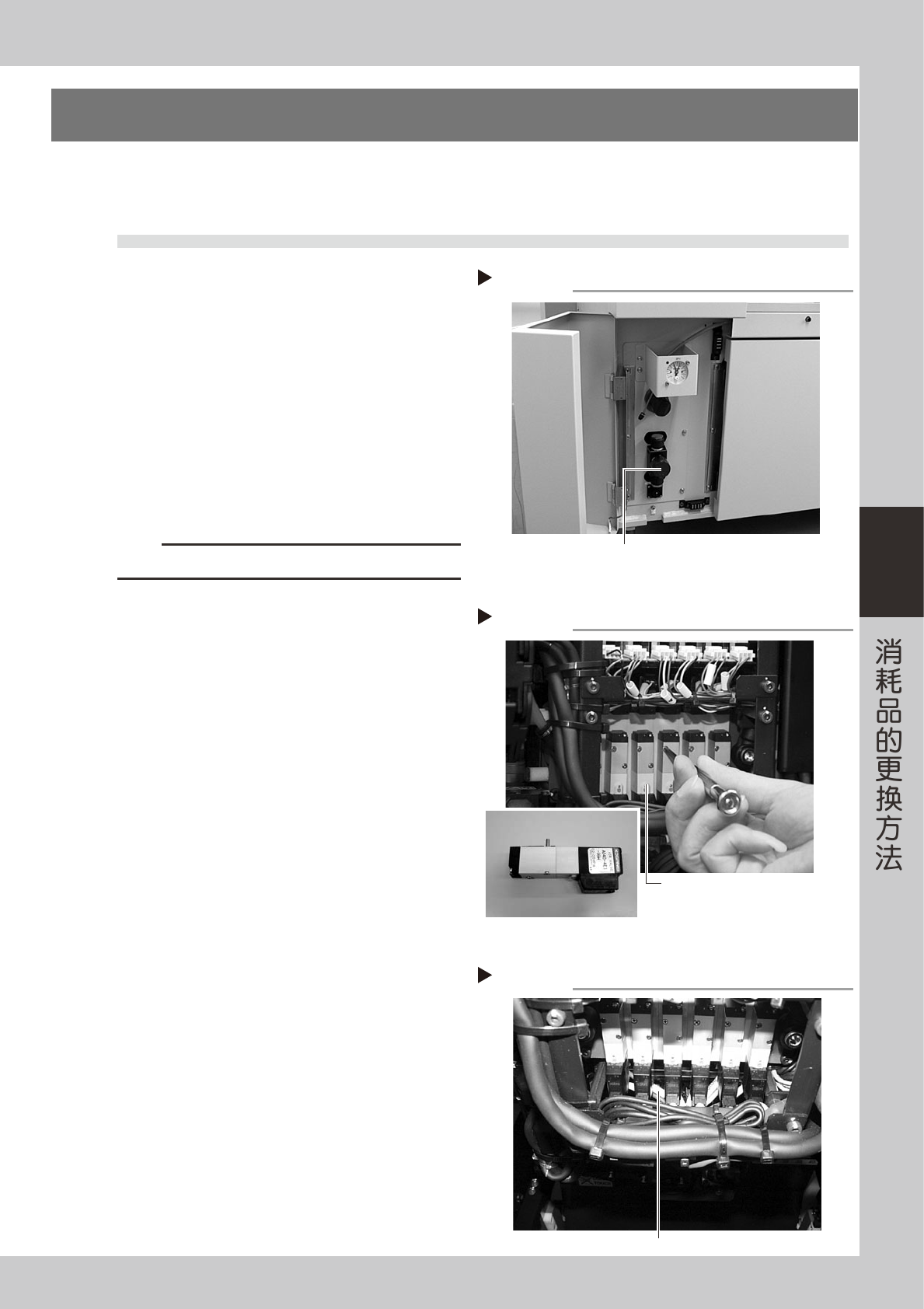 4-8 4 6 . 2 低 速 阀 的 更 换 本 节 主 要 介 绍 切 换 贴 装 头 上 下 速 度 的 低 速 阀 的 更 换 方 法 。 1 切 断 气 源 和 机 器 的 电 源 。 将 机 器 左 下 方 面 板 内 的 供 气 / 排 气 开 关 向 右 旋 转 , 切 断 供 气 后 , 再 关 闭 机 器 的 电 源 开 关 。 2 拔 下 插 头 。 将 排 出 器 阀 、 贴 装 头 上 下 阀 、 真 空 …