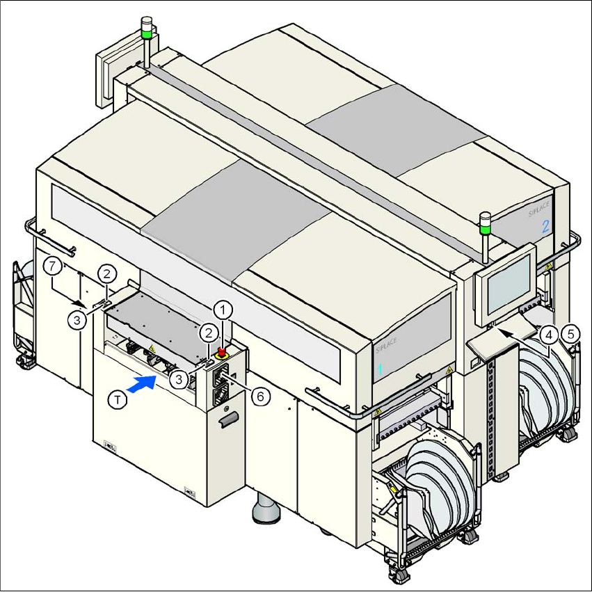 2 Driftsäkerhet Skötselinstruktion SIPLACE D3 2.6 Säkerhetsanordningar Från programversion SR.605.xx Utgåva 07/2008 SE 70 2 Bild 2.6 - 4 Placering för brytare och k nappar - blick på kretskortinmatningssidan (1) NÖDSTOPP…