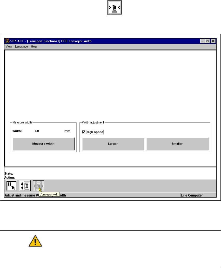 5 Single Functions User Manual SIPLACE S -23 HM 5.3 Single functions, Transport Software Version SR.405.xx 05/99 Issue 164 5.3.2.1 General comment s The "PCB c onveyor wi dth" screen m akes av ailable all fu nc…