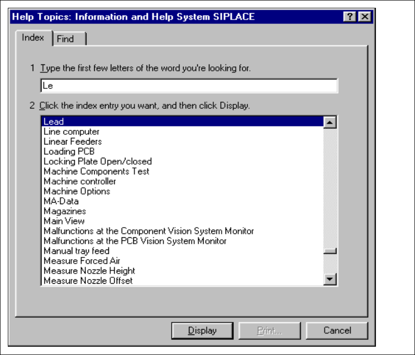 9 Online Help System User Manual SIPL ACE S-23 HM 9.1 General S oftware Version SR.405.xx 05/99 Issue 350 9.1.2.3 Searching f or a help topic The station compu ter ’s help s ystem al lows you to search for spec ific he l…