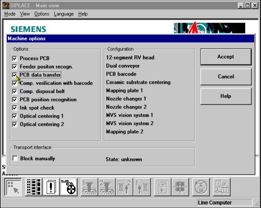 The ’Machine options’ menu contains a ’PCB data transfer’ option. The aim of this function is to