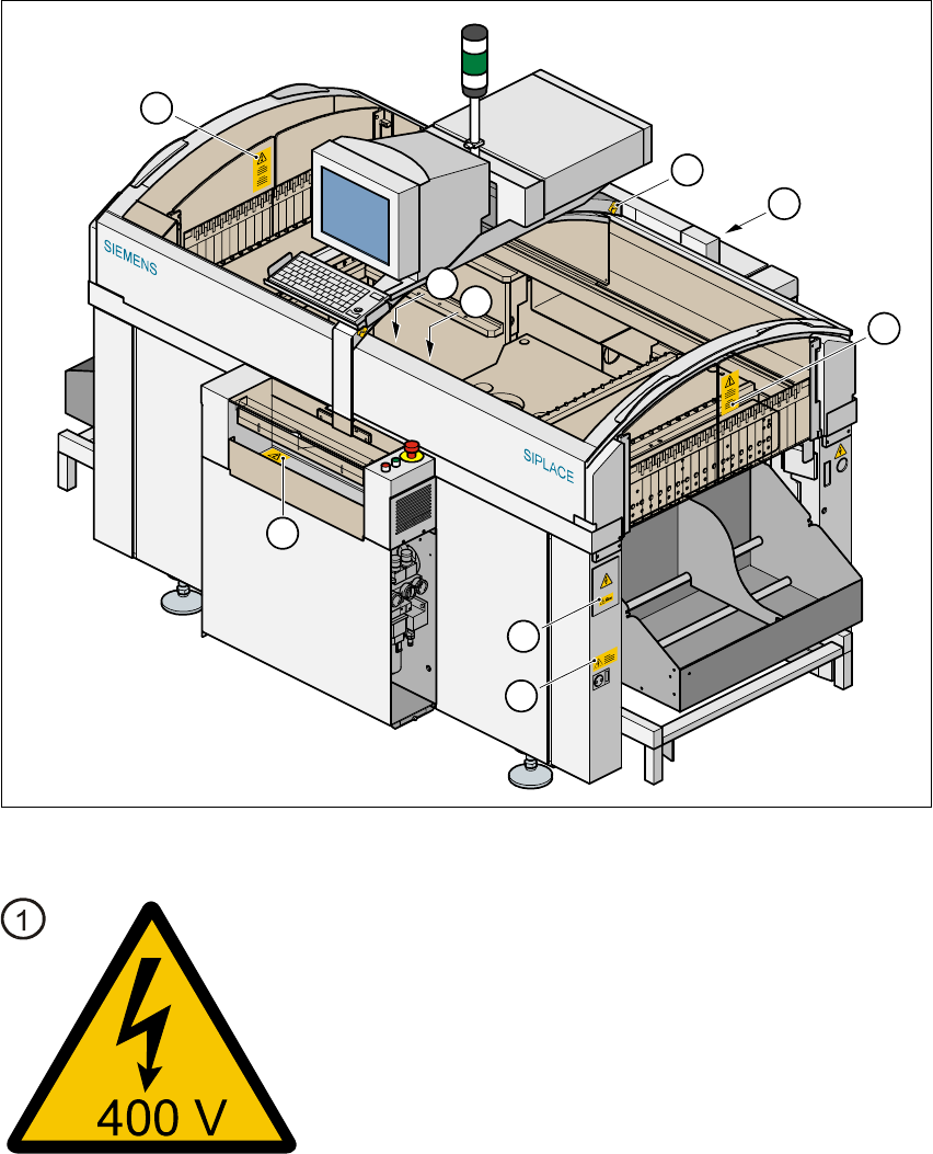 The following diagram shows the position of the warning signs on the basic machine. 2