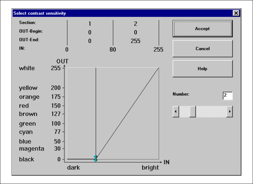 User Manual S-23 HM 6 Vision functions Software Vers ion SR.405.xx 05/99 Iss ue 6.6 Test Component 267 Graphic presentati on of the tabl e 6 In the diag ram 6 – t he absc issae (x ax is) r epresent the input v alues ran …
