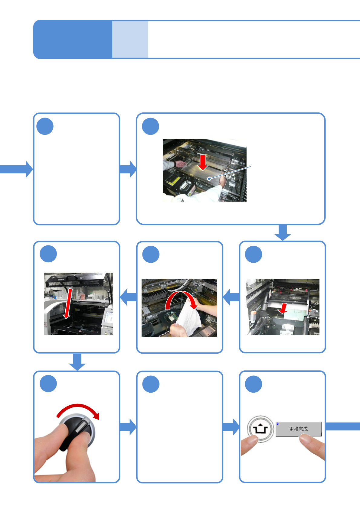 NPM- TT2 EJM1EC-MB-05 M-03 维修保养篇 5-3-2 安装托盘供料器或 者交换台车 ●托盘供料器时 (→P.14 -8) ●交换台车时 (→P.3- 2) 取下棉纱布 清扫基板座和基板 支撑块 9 12 11 13 15 16 14 SERVO ON 把供料器工作台盖 返回原位 ACTIVATION 5-3-2 -3 基板支撑 块的清扫 平稳 ( 无倾斜 ) 地安装基板支撑块 ( 否则会与轨道产生干涉) 基板支撑…