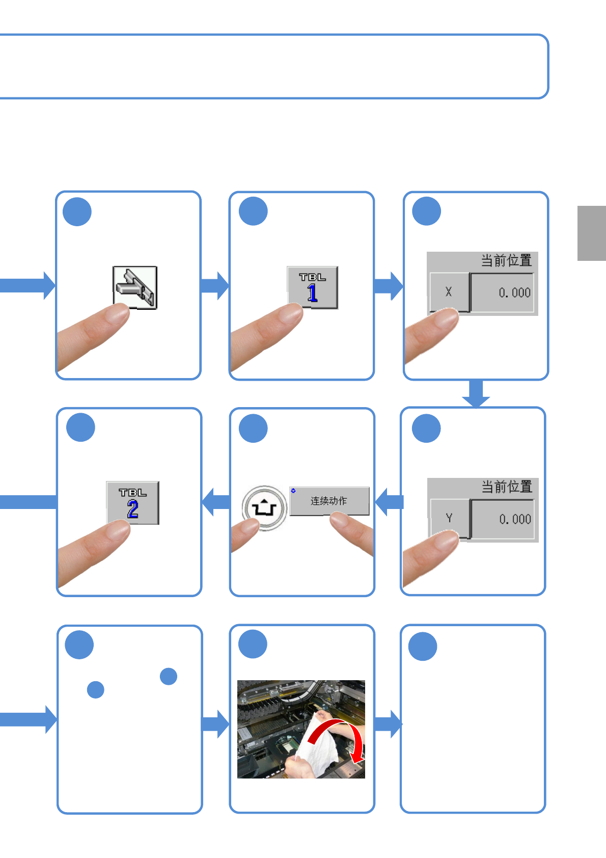 NPM- TT2 EJM1EC-MB-06 M-03 ACTIVATION 6-2 -6 16 往返 10 次 选择 Y 轴 17 选择工作台 12 13 选择工作台 14 选择 X 轴 每 5 6 0 小 时 保 养 定 期 检 查 15 25 安装托盘供料器或 者交换台车 ●托盘供料器时 (→P.14 -8) ●交换台车时 (→P.3- 2) 23 ●实施三次步骤 到。 9 22 24 取下棉纱布
