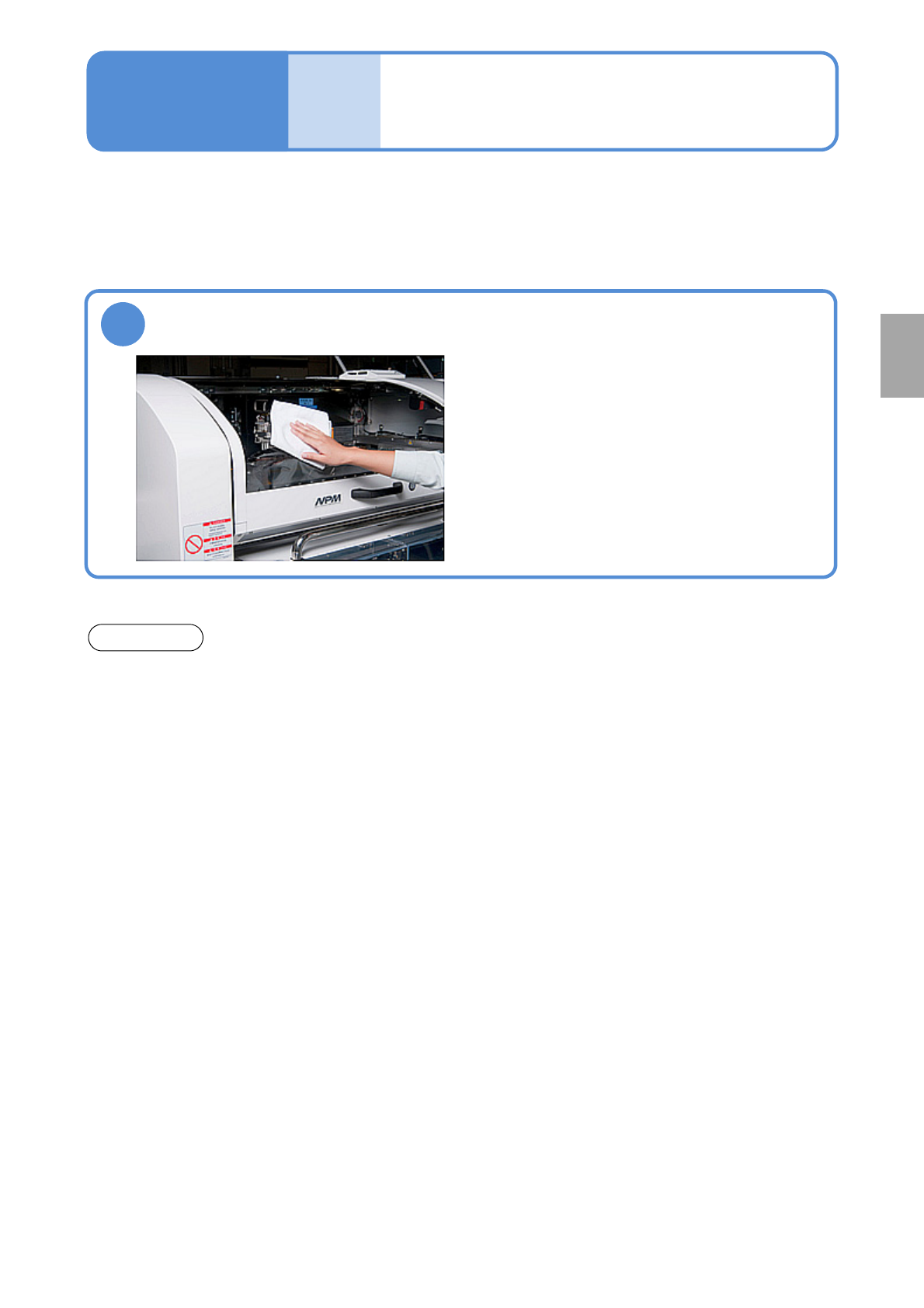 NPM- TT2 EJM1EC-MB-06M-03 安全盖的清扫 对安全盖的清扫方法进行说明。 使用工具 : 棉纱布、 清洁且柔软的布 所需时间 :5 分钟 ●安全盖不限定每月 1 次,有灰尘等污垢时请 随时清扫。 1 清扫安全盖 ●因为安全盖容易受损伤,请注意磨 损或划痕。 注意 6-15 维修保养篇 6-15 每 5 6 0 小 时 保 养 定 期 检 查 ● 请不要使用酒精以及稀释剂、各种清洁剂 ( 溶剂 ) 、各种洗涤剂 。 否…