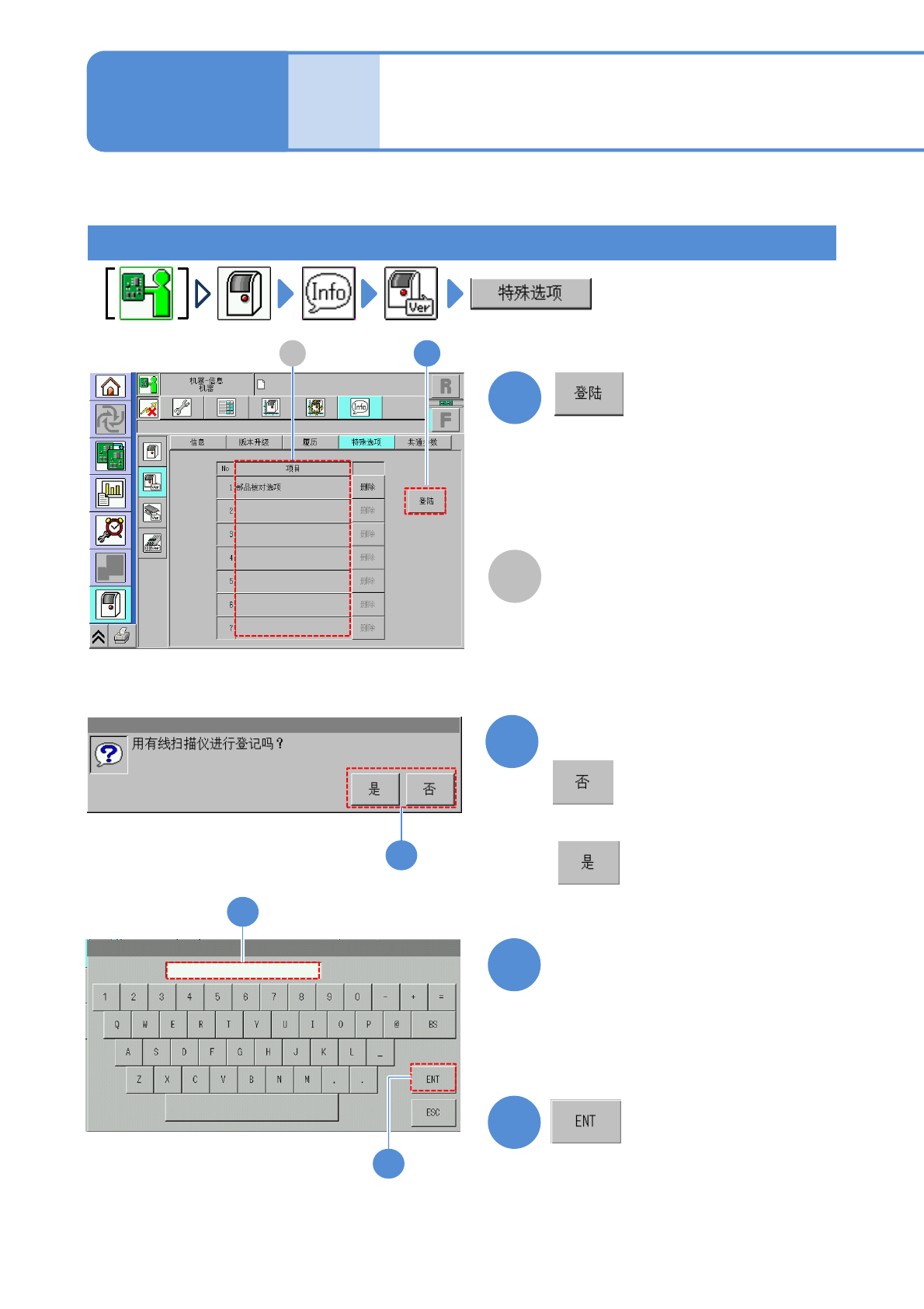 NPM- TT2 EJM1EC-MB-15 M-00 15-3 -1 维修保养篇 15-3 A 项目 1 登录选项许可 对选项许可的登录和删除方法进行说 明。 显示已登录在设备的选项许可。 A 1 确认提示 2 4 ( 显示登录后的选项 ) 显示是否使用有线扫描仪进行登录的 提示 ●使用有线扫描仪 : ●不使用有线扫描仪 : 2 ■使用有线扫描仪时 ●输入选项列表中记载的 “ 选项编号 ” 。 ●选项列表中记载的序号与设备上所贴 产品标…