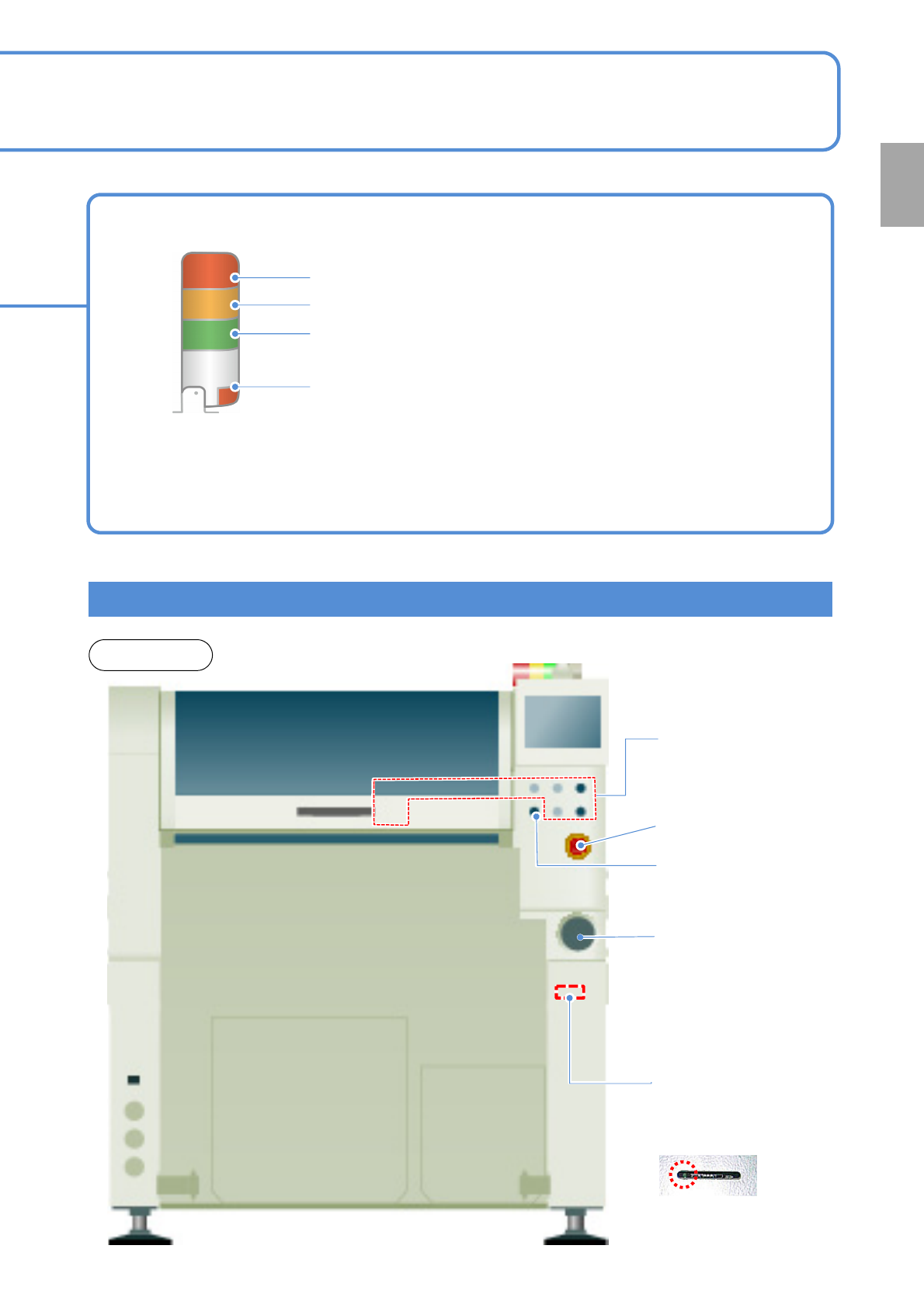 NPM- TT2 EJM1EC-SF-01N-05 1-9-1 -2 操作单元 各种操作开关 进行运转开始和停止等操 作。 伺服开关 伺服系的动力为 ON 或者 OFF 。 紧急停止开关 紧急停止运转。 主电源开关 ( 前侧 ) 电源以及空压源为 ON 或 者 OFF 。 ( 主电源开关为 OFF 时,会 联锁达到气压降低 ) SD 卡插槽 ( 前侧 ) 进行各种数据的读取和写 入。 信号塔 红色 : 按紧急停止开关时和错误停 止时会亮…