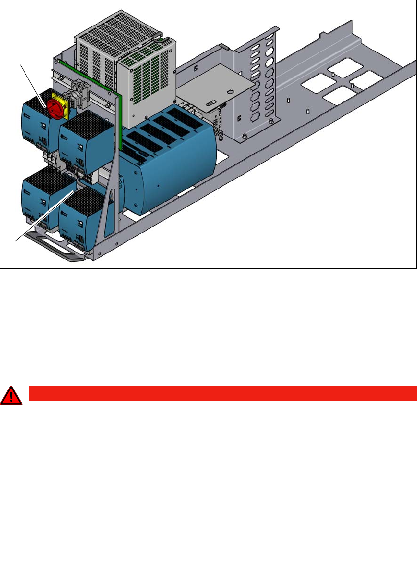 Driftsinstruktion SIPLACE X-serie S 2 Driftsäkerhet Fr.o.m. programversion 713.0 Utgåva 11 /2019 2.7 Restspänning och urladdningstider 91 2 Bild 2.7 - 1 Elaggregat, framsidan (1) Huvudbryt are (S1) (2) Nätanslutningsplin…