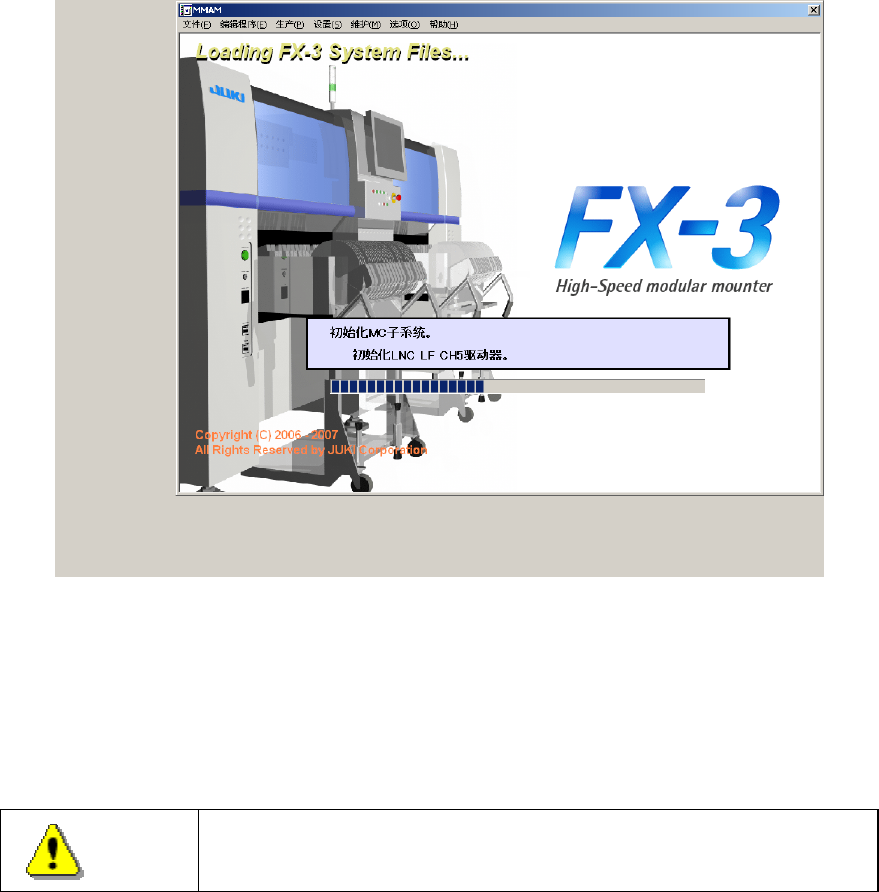 第1部 基本篇 第2章 生产 2-7 (2) Windows XP 启动后,会显示下列启动画面。 图 2-3-1-2 启动画面 (3) 初始设置结束后会显示主画面,然后显示返回原点画面 (参见图 2-3-1-3)。单击“确定”按钮 ※1 ,可执行 返回原点 (图 2-3-1-4)。 ※1:将画面上的箭头对准<确定>按钮后,按一次鼠标左键。 警告 进行返回原点后,装 置即刻开始运转。为避免受 伤,请绝对不要将手和 头等伸入装置…