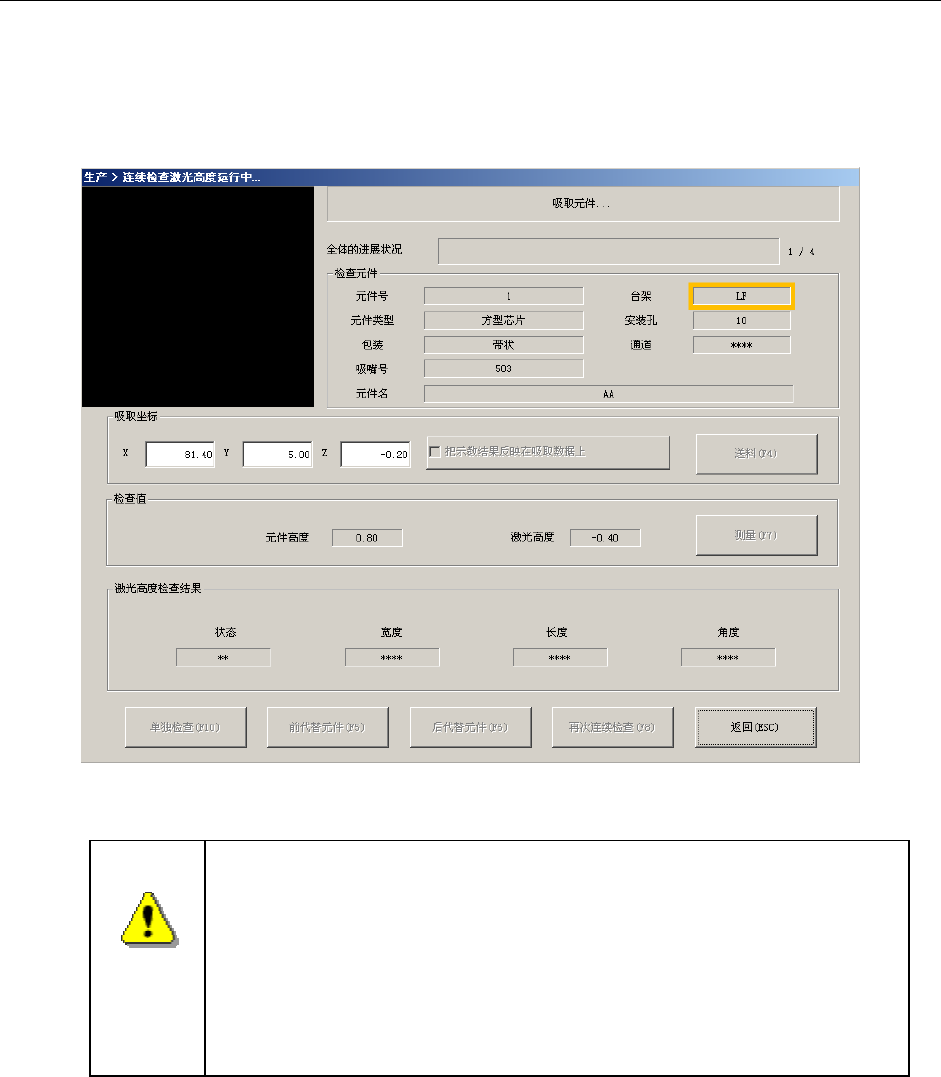 连续检查激光高度中,显示正在进行连续检查激光高度的元件内容/吸取位置/激光高度,依次显