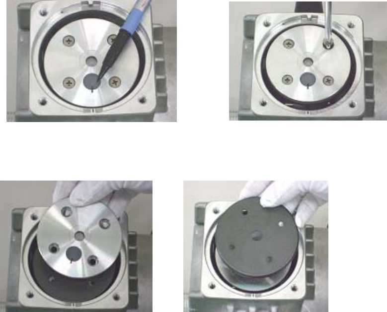 第 1 部 基本篇 第 3 章 维护 3-6 ○压板、皮碗垫圈、吸气阀防干 扰橡胶的拆除方法 1) 请用油性记号笔按照外壳标记部分在 压板 上做标记。 3) 请拆除压板和皮碗垫圈 。 2 ) 请拆下压板的 4 个小平头螺丝。