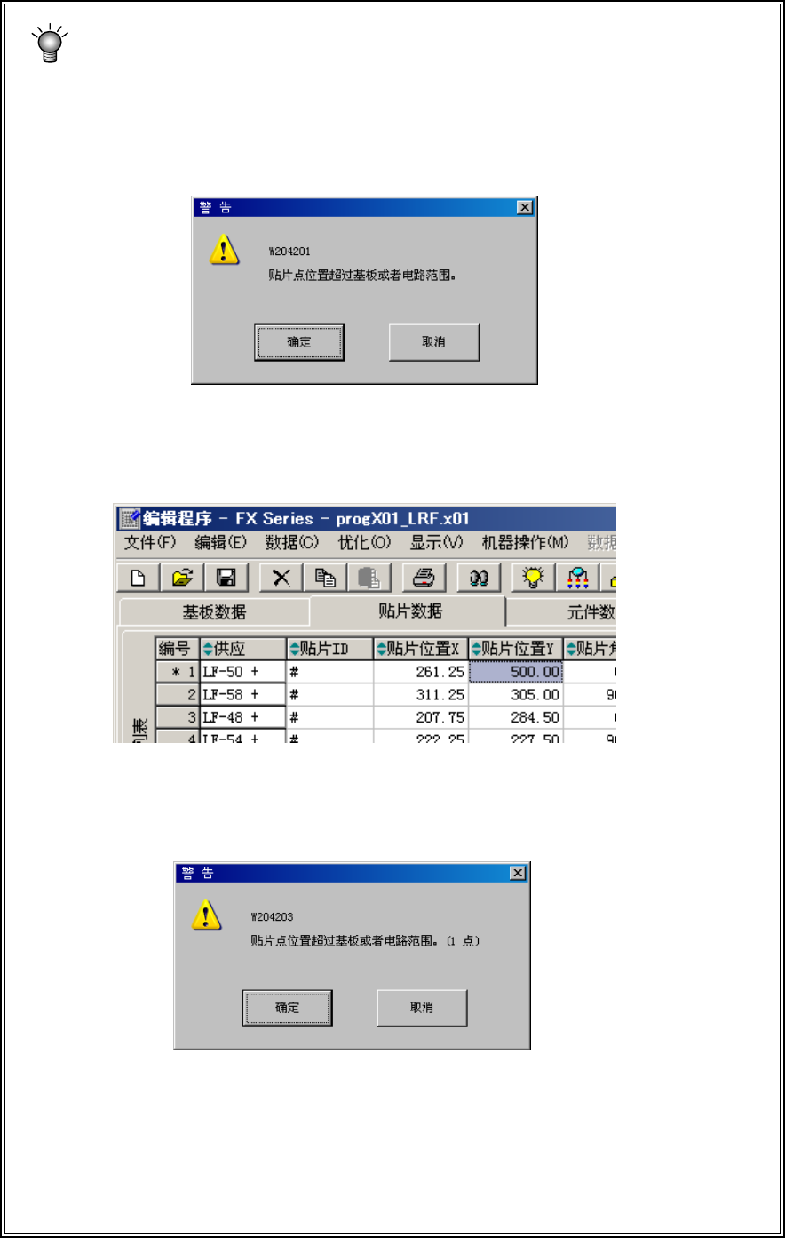 在输入贴片位置 X 或 Y 时,或分别进行了改变时,将进行范围检查。